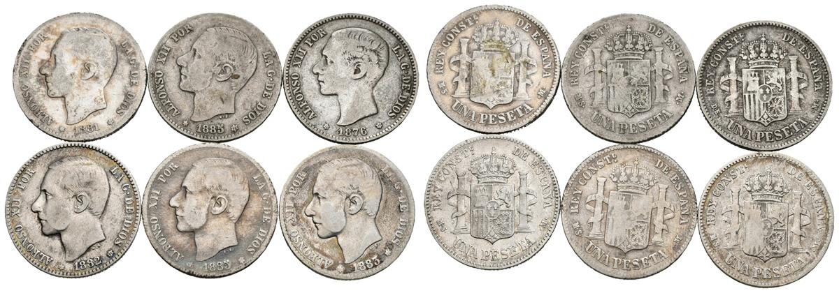 CENTENARIO DE LA PESETA. Lote compuesto por 6 monedas de 1 Peseta de Alfonso XII de 1876 *18-76 DEM, 1881 *__-81 MSM, 1882 *__-82 MSM, 1883 *__-__ MSM, 1885 *__-__ MSM y 1885 __-86 MSM. Ar. BC-/MBC-. A EXAMINAR.