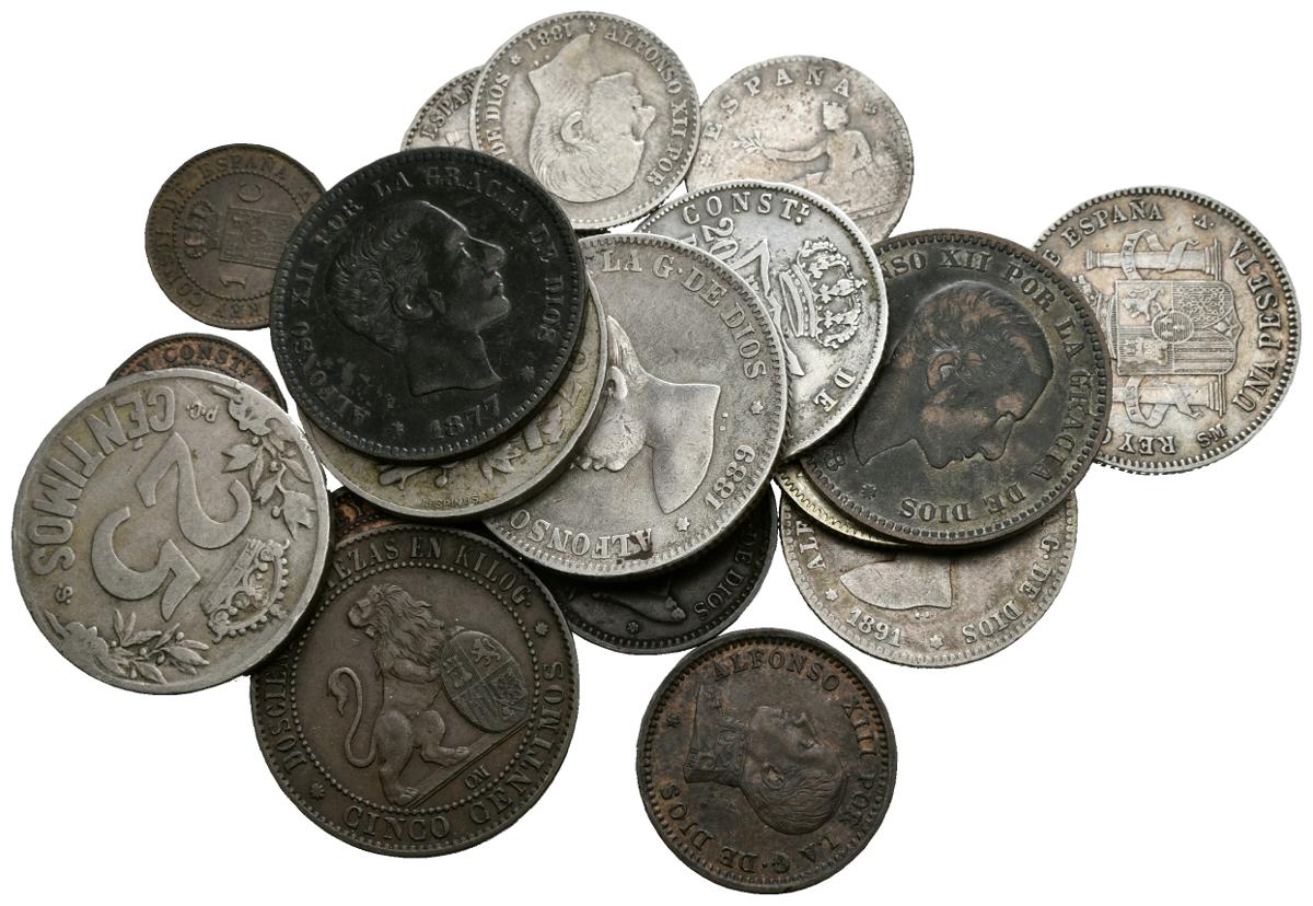 CENTENARIO DE LA PESETA. Lote compuesto por 19 monedas del Gobierno Provisional, Alfonso XII y Alfonso XIII. Conteniendo 9 cobres de diferentes valores, 8 de plata de diferentes valores (incluyendo 2 Pesetas 1889 MPM y 20 Centavos de Peso 1882 Manila) y 2 monedas de 25 Céntimos de Cu-Ni. BC-/EBC-. A EXAMINAR.