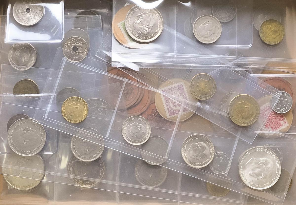 ESTADO ESPAÑOL Y II REPUBLICA. Resto de colección compuesta por 95 monedas de distintos valores, todas diferentes con diversas conservaciones, incluyendo 4 monedas de 100 Pesetas de plata y 8 monedas cartón de la II República. A EXAMINAR.