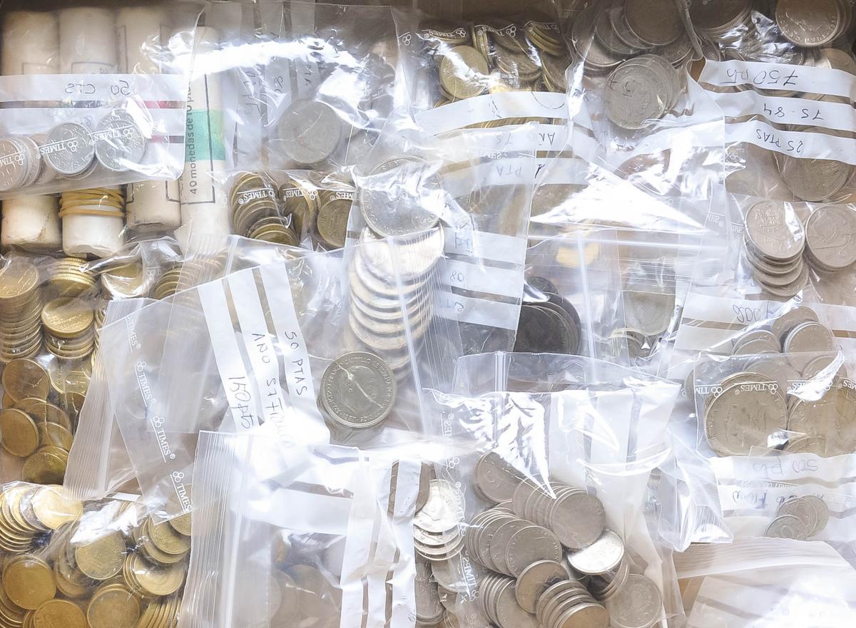 ESTADO ESPAÑOL y JUAN CARLOS I. Lote compuesto por cientos de monedas de diferentes valores, conteniendo 4 cartuchos oficiales de la F.N.M.T. Incluye un pequeño conjunto de monedas de Alfonso XII y Gobierno Provisional, así como 60 monedas de diferentes países. BC-/SC. A EXAMINAR.