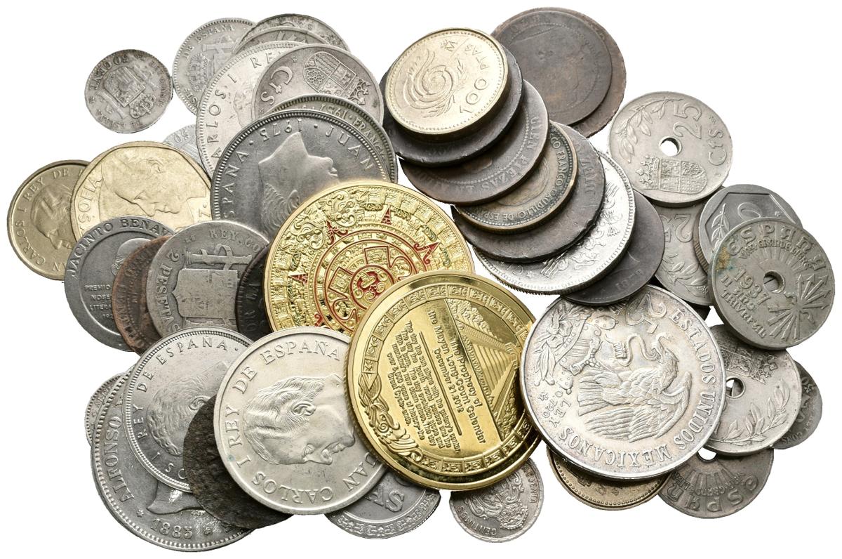 ESPAÑA. Lote compuesto por 51 monedas, conteniendo gran variedad de monedas de los mandatos de Felipe IV, Isabel II, Gobierno Provisional, Alfonso XII, Alfonso XIII, Guerra Civil, Estado español y Juan carlos I. Incluye varias monedas de plata, facial y 3 monedas de México. BC/EBC. A EXAMINAR.