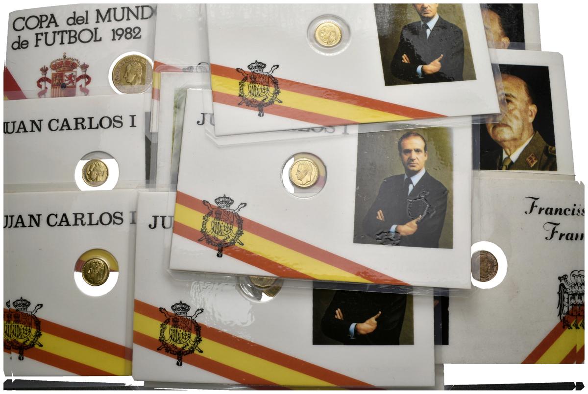 ESPAÑA. Lote compuesto por 12 carnets con medallas de Francisco Franco (5), Millán Astray (1) y Juan Carlos I (6, una de estas del mundial de 1982), chapadas en oro. A EXAMINAR.