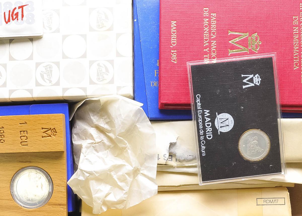 ESPAÑA. Lote compuesto por Cartera de 1987 (*E-87). III Exposición Nacional de Numismática con medalla conmemorativa, en cartera oficial F.N.M.T., 200 Pesetas 1992 Madrid Capital Europea de la Cultura: Cibeles, en presentación original, con certificado (Ar), Tres monedas de 1 Ecu 1989 Europa (Ar), Dos estuches oficiales de 500 Pesetas "Así nace una moneda", conteniendo 4 pruebas de 500 pesetas, Reverso "PRUEBA", UNA MONEDA DE 500 pesetas y una medalla. XXV Aniversario de la boda de SSMM los Reyes de España, Dos medallas de la UGT 1988, 22 Medallas de exposiciones Numismáticas-Filatélicas (5 Plata) y diversas monedas variadas de Juan Carlos I. EBC/SC. A EXAMINAR.