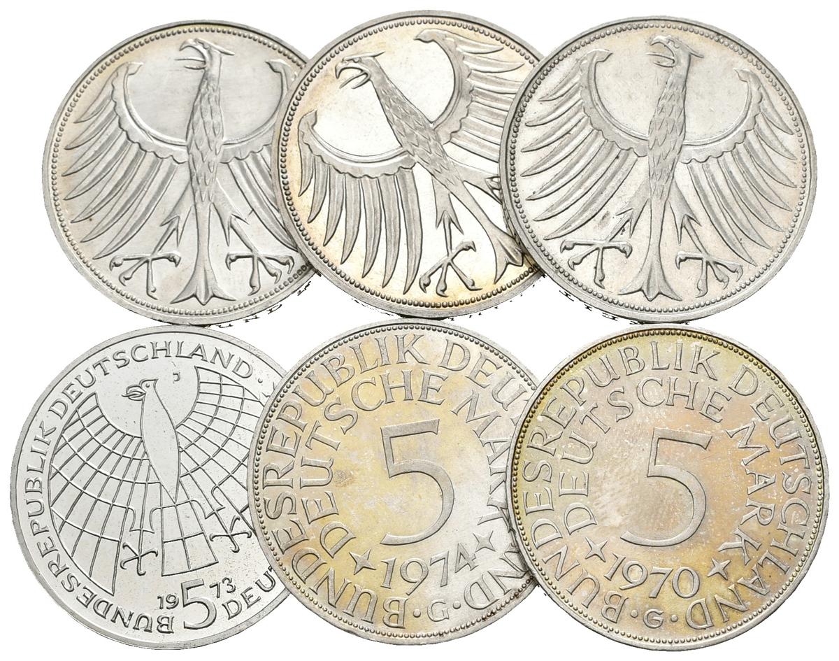 ALEMANIA. Lote compuesto por 6 monedas de 5 Mark de los años: 1964, 1965, 1968, 1970, 1973 y 1974. Ar. Preciosas pátinas. MBC/PROOF.