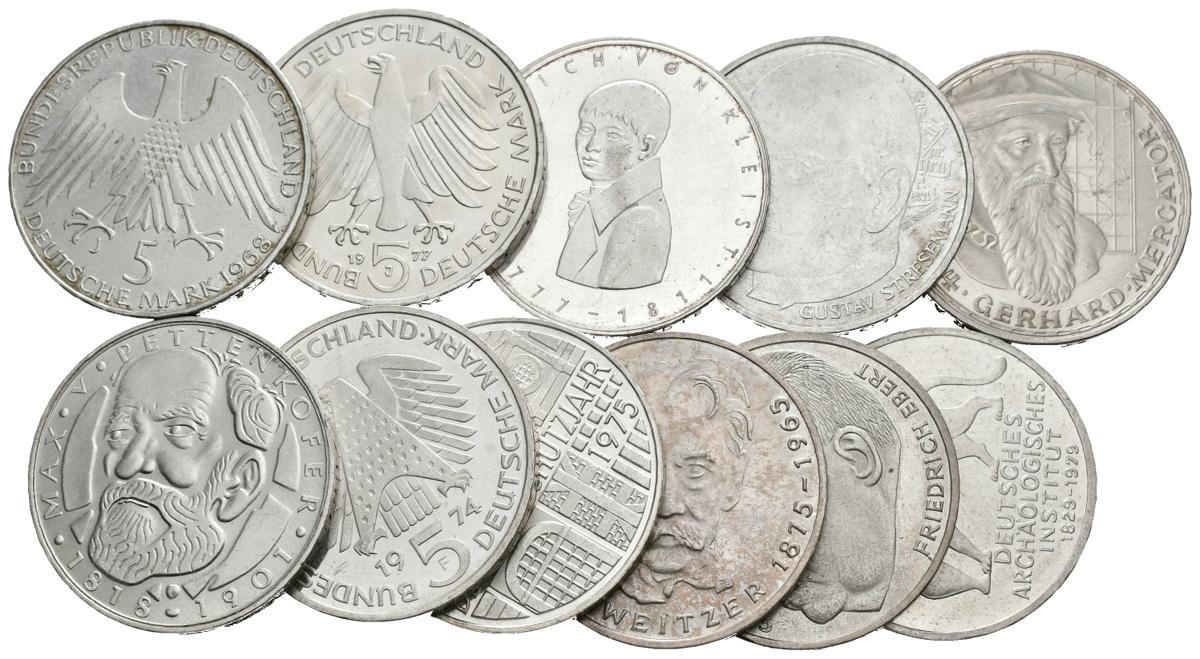 ALEMANIA. Lote compuesto por 11 monedas de 5 Mark, todas emisiones conmemorativas de 1968 D-J (2), 1969 F, 1974 F, 1975 F-G (3), 1977 G-J, 1978 D y 1979 J. Ar. EBC-/SC-.