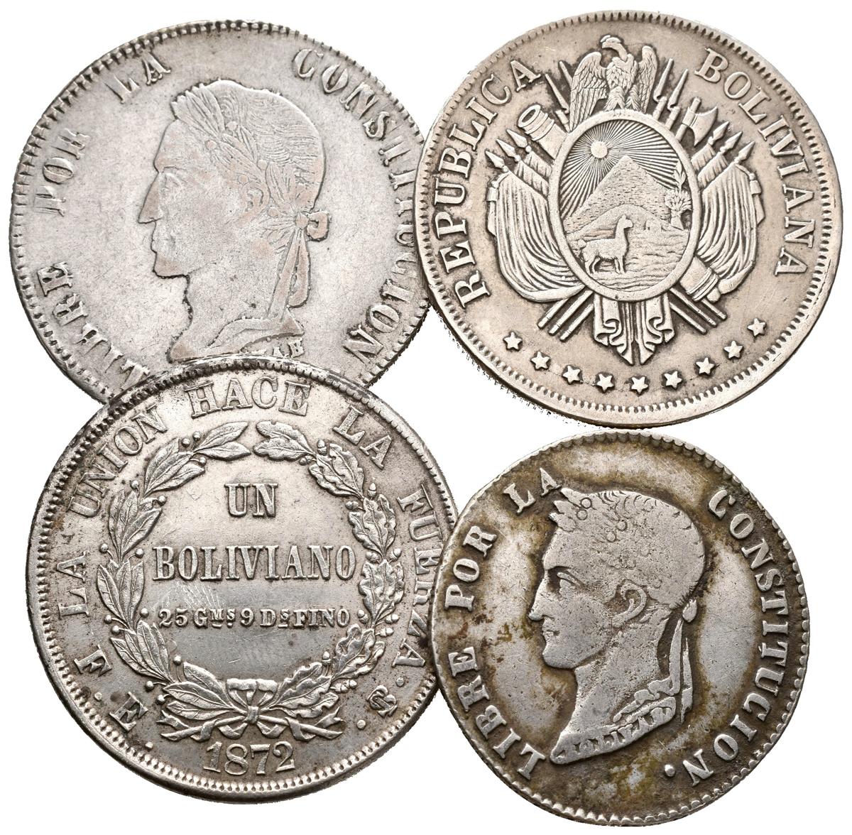 BOLIVIA. Lote compuesto por 1 Boliviano 1872, Potosí (Dos tipos), 4 Soles 1858 FJ y 8 Soles 1862 Falsos de Epoca. Ar. A EXAMINAR.