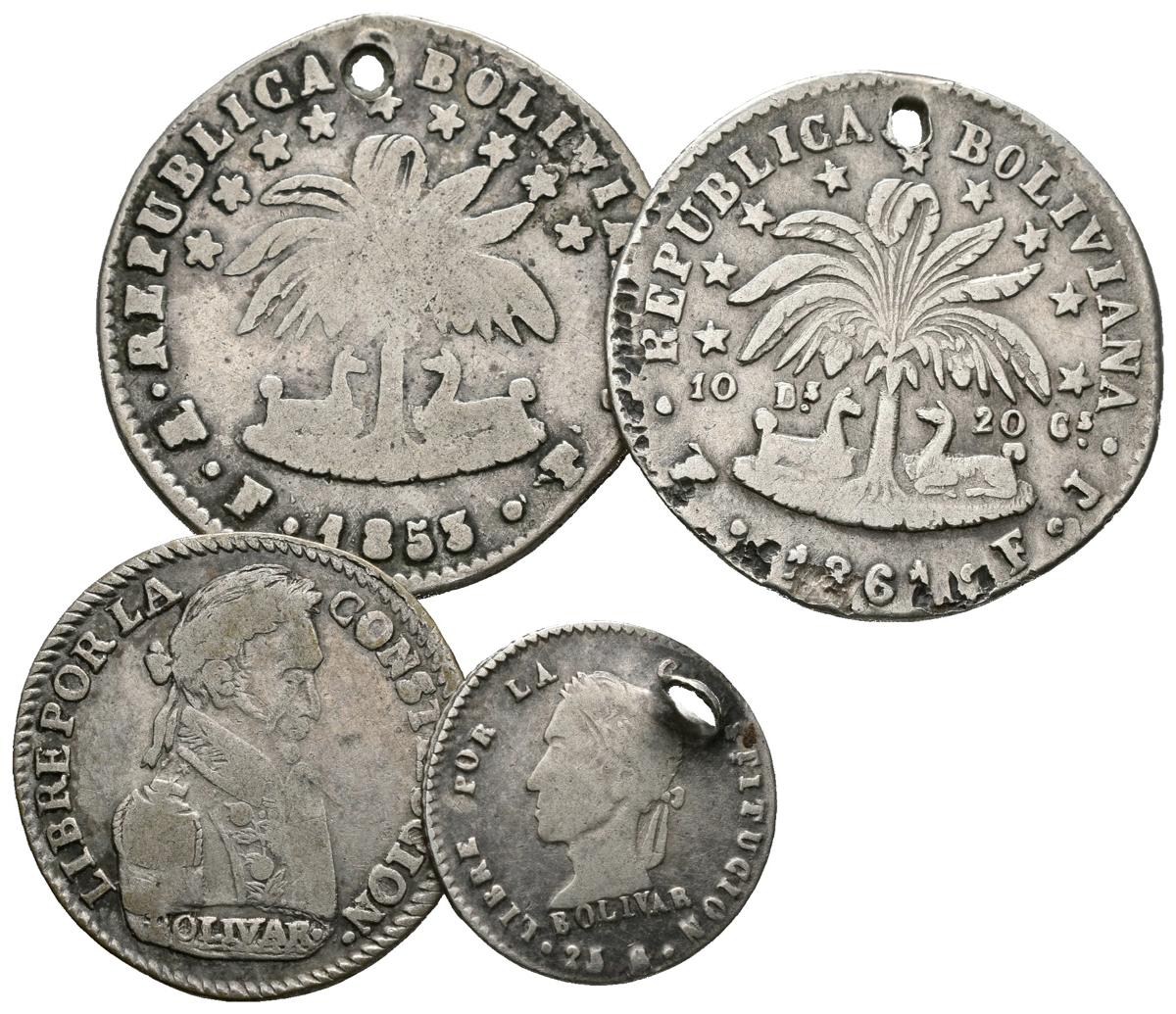 BOLIVIA. Lote compuesto por 4 monedas de plata, conteniendo: 1/2 Sol 1863 FP; 1 Sol 1830 JL y 2 Soles 1853 FP, 1861 FJ. Ar. Tres con perforación. A EXAMINAR.