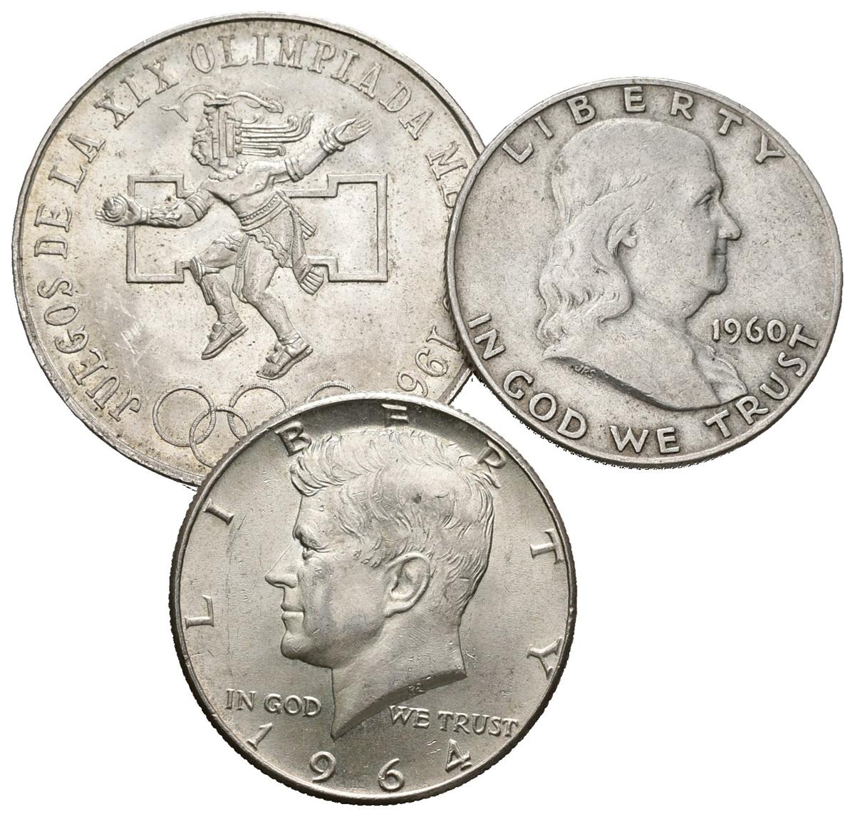 ESTADOS UNIDOS y MEXICO. Lote compuesto por 3 monedas de plata, conteniendo: 1/2 Dollar 1960 D, 1964 y 25 Pesos 1969. Ar. MBC/SC-. A EXAMINAR.