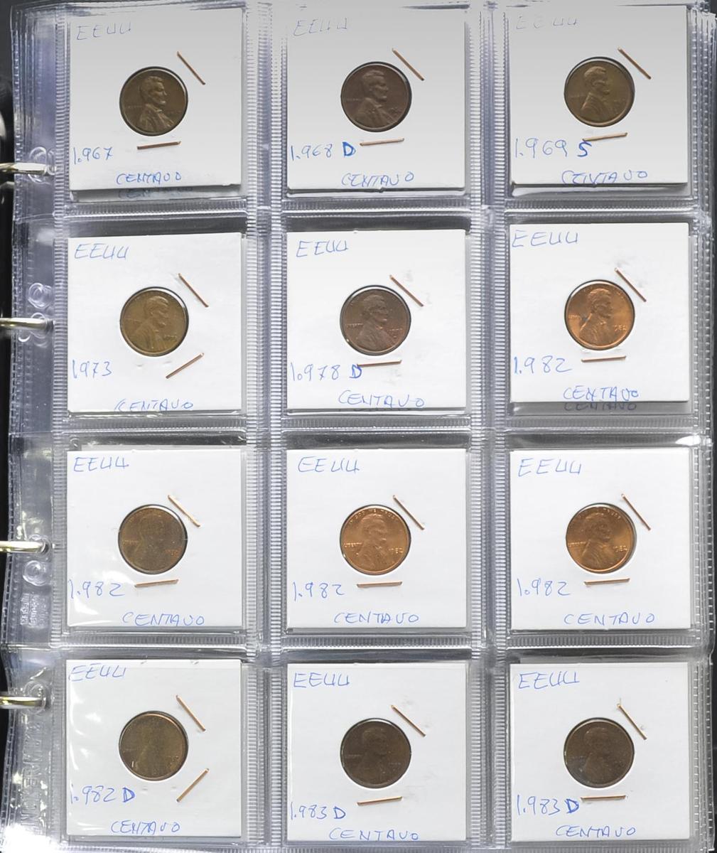 ESTADOS UNIDOS. Colección avanzada presentada en álbum con 184 monedas, conteniendo de 1 Cent. 1967, 1968 D, 1969 S, 1973, 1978 D, 1982, 1982 D, 1983 D, 1984, 1984, 1985, 1985 D, 1986 D, 1987, 1988, 1988 D, 1989, 1989 D, 1990, 1990 D, 1991, 1991 D, 1993, 1994, 1994 D, 1995, 1995 D, 1996 D, 1997, 1998, 2004, 2005 D, 2007 D; 1 Dime. 1906, 1914 D, 1918 D, 1923, 1923 S, 1926 S, 1927, 1928, 1942, 1954, 1956 D, 1977, 1978 D, 1980 P, 1982 D, 1983 P, 1984 P, 1986 P, 1986 D, 1988 P, 1989 D, 1990 P, 1990 D, 1991 D, 1992 P, 1994 D, 1995 D, 1998 P, 2002 D, 2004 P; 5 Cent. 1939, 1946, 1969 D, 1969 S, 1970 D, 1974, 1976, 1977, 1978 S, 1981 P, 1983 D, 1985 D, 1987 D, 1989 D, 1990 D, 1994 P, 1994 D, 1995 D; 1/4 Dollar. 1936, 1939, 1940, 1941, 1941 S, 1967, 1973, 1976, 1979, 1980 D, 1981 S, 1983 D, 1987 D, 1988 D, 1989 D, 1991 D, 1991 P, 1992 D, 1994 P, 1994 D, 1995 D, 1996 D, 1998 P, 1998 D, 1999 P (G, C y D), 2000 P (SC y NH), 2001 D (NC), 2003 P (M), 2004 P (T y M), 2005 D (K) y 1 Dollar. 1979 P, D y S. Incluye algunas de plata. MBC/SC. A EXAMINAR.