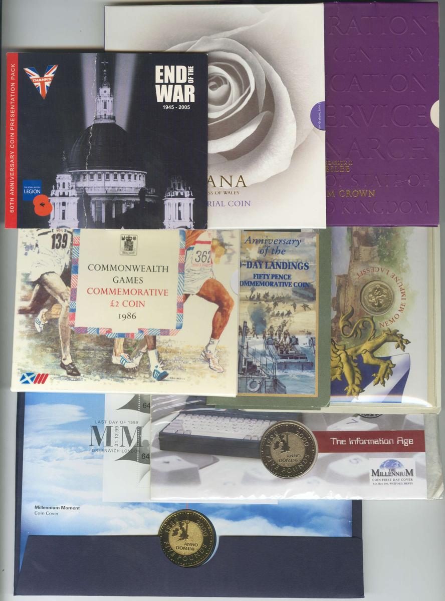 GRAN BRETAÑA. Lote compuesto por 8 carteras oficiales. Conteniendo: Diana, Princesa de Wales 1999; Bodas de oro 2002; The Information Age 2000; End of the War 1945-2005; The scottish one pound coin 1996; Commonwealth games 1986; D-Day Landings 1994 y Millenium Moment 2000. Algún estuche con desperfectos. SC.