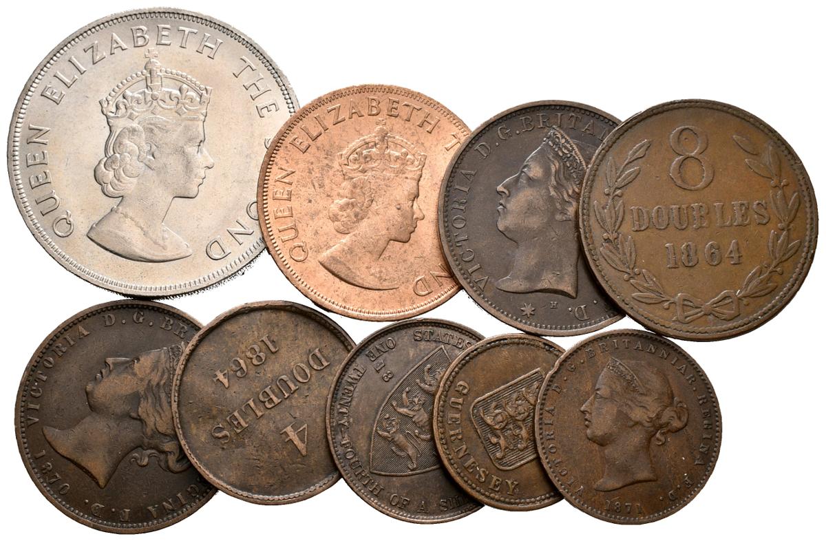 JERSEY y GUERNESEY. Lote compuesto por 9 monedas, conteniendo: Jersey. 1/26 Shilling 1871, 1/24 Shilling 1877, 1/13 Shilling 1870, 1/12 Shilling 1877, 1/12 Shilling 1966, 5 Shillings 1966 y Guernesey. 2 Doubles 1868, 4 Doubles 1864, 8 Doubles 1864. Ae, Cu/Ni. MBC-/EBC. A EXAMINAR.