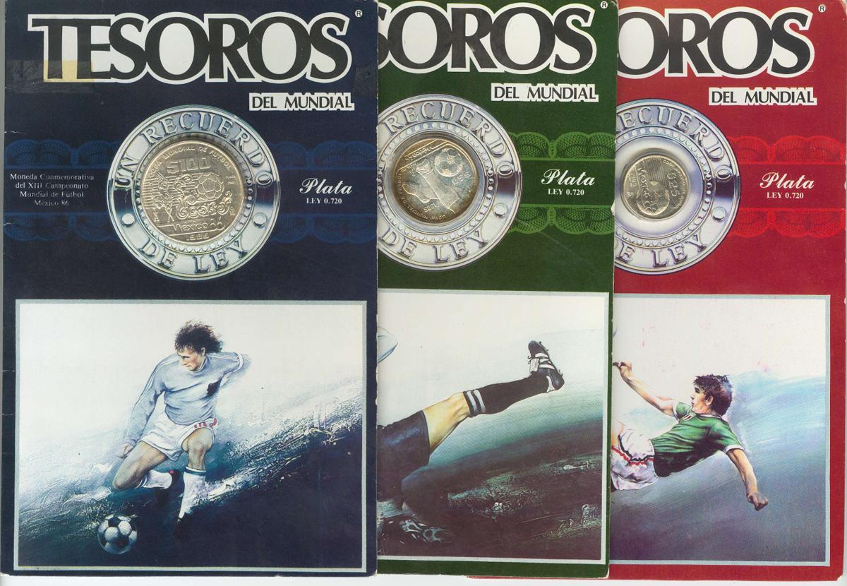 MEXICO. 25, 50 y 100 Pesos. 1985. Tesoros del mundial de fútbol México 86. Presentados en estuches originales. Ar. Leves desperfectos en los estuches. SC.