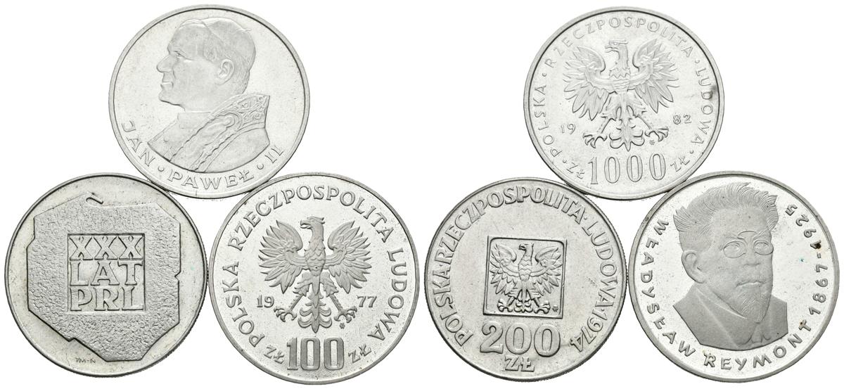 POLONIA. Lote compuesto por 3 monedas de Plata. Conteniendo 100 Zlotich. 1977. Y#89. Ar. 16,73g.; 200 Zlotich. 1974. Par. 304. Ar. 14,41g. y 1000 Zlotich. 1982. Par. 337. Ar. 14,58g. Ligera tonalidad. SC.