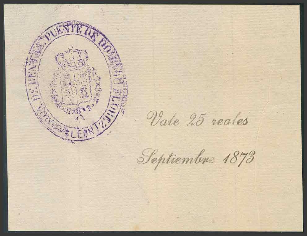25 reales. Septiembre de 1873. Vale de la Administración de Rentas de Puente de Domingo Flórez (León). (Edifil 2017: Página 26). EBC.