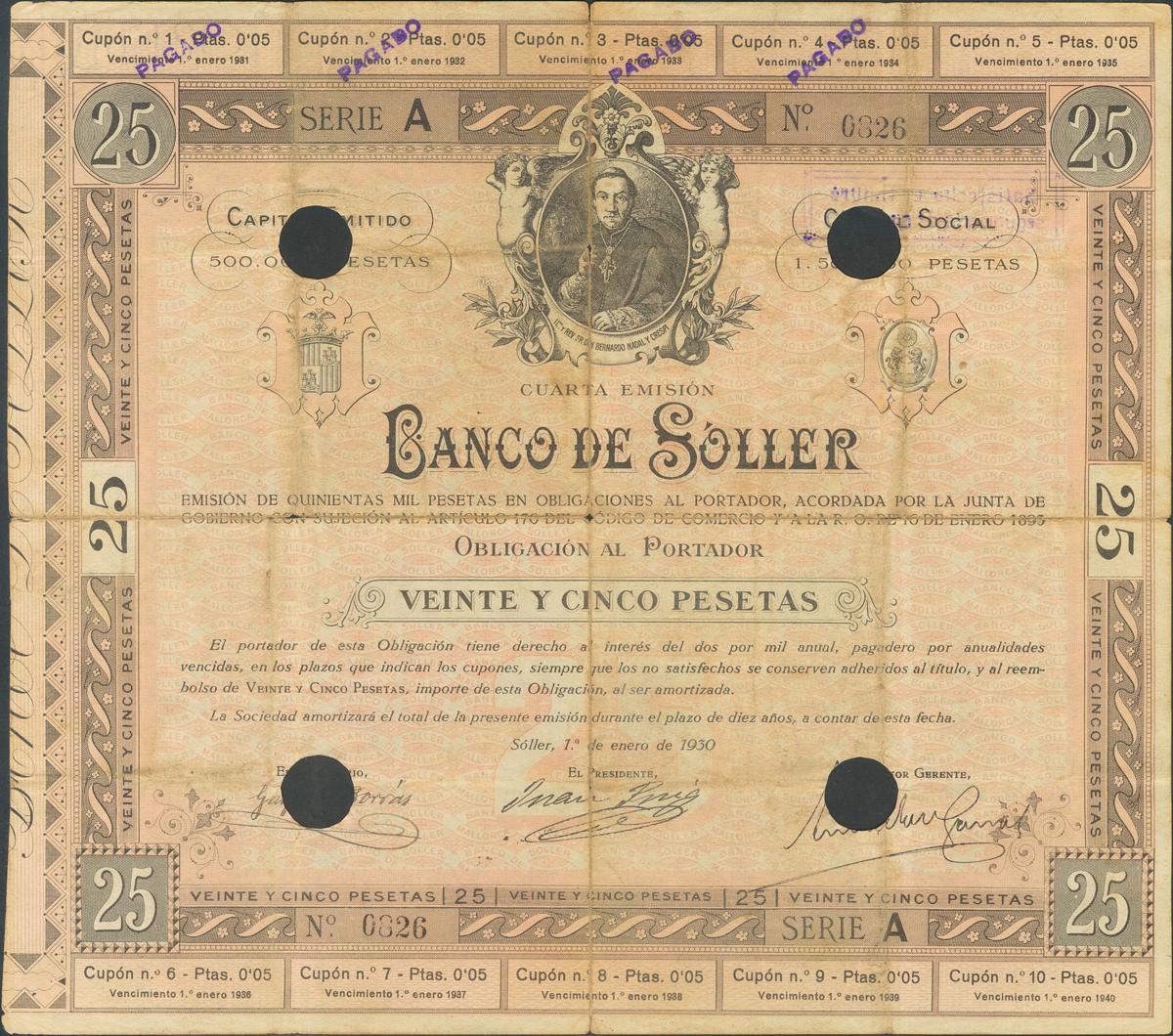 BANCO DE SOLLER (Mallorca). Obligación 25 Pesetas. 1 Enero 1930. Taladros. R/ Imagen del pueblo. MBC-. Rara.