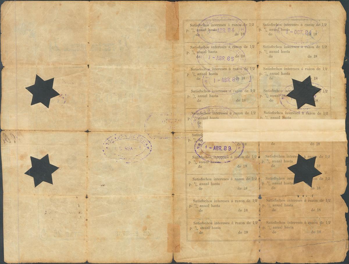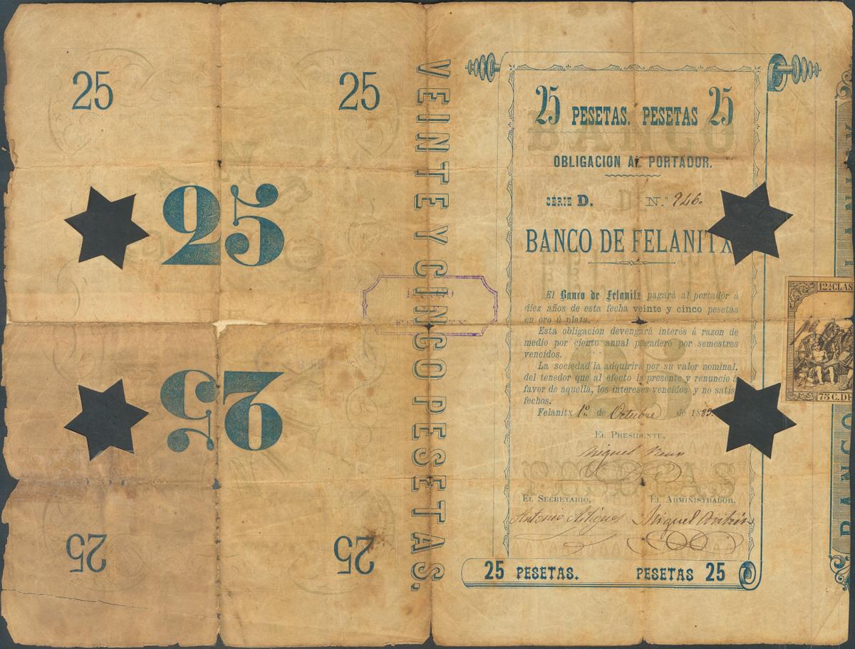 BANCO DE FELANITX (Mallorca). Obligación 25 Pesetas. 1 Octubre 1889. Taladros en forma de estrella de 5 puntas. MBC-. Rara.