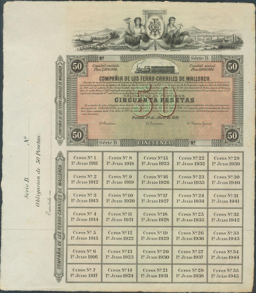 COMPAÑIA DE LOS FERROCARRILES (Mallorca). Obligación 50 Pesetas. 1911. Muy raro de ver completo con matriz y cupones. SC. Rara así.
