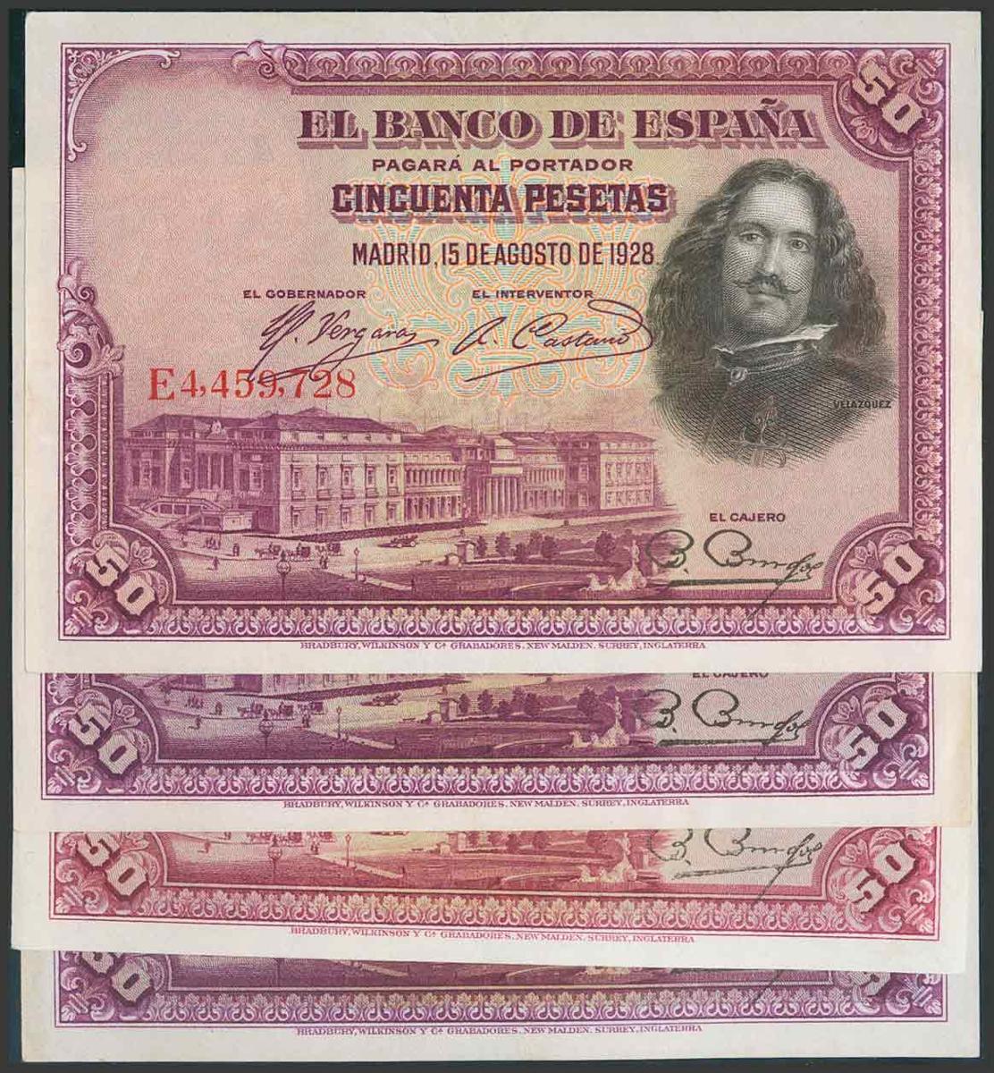 Conjunto de 4 billetes de 50 Pesetas emitidos el 15 de Agosto de 1928, Series B, C, D y E (Edifil 2017: 354). EBC.