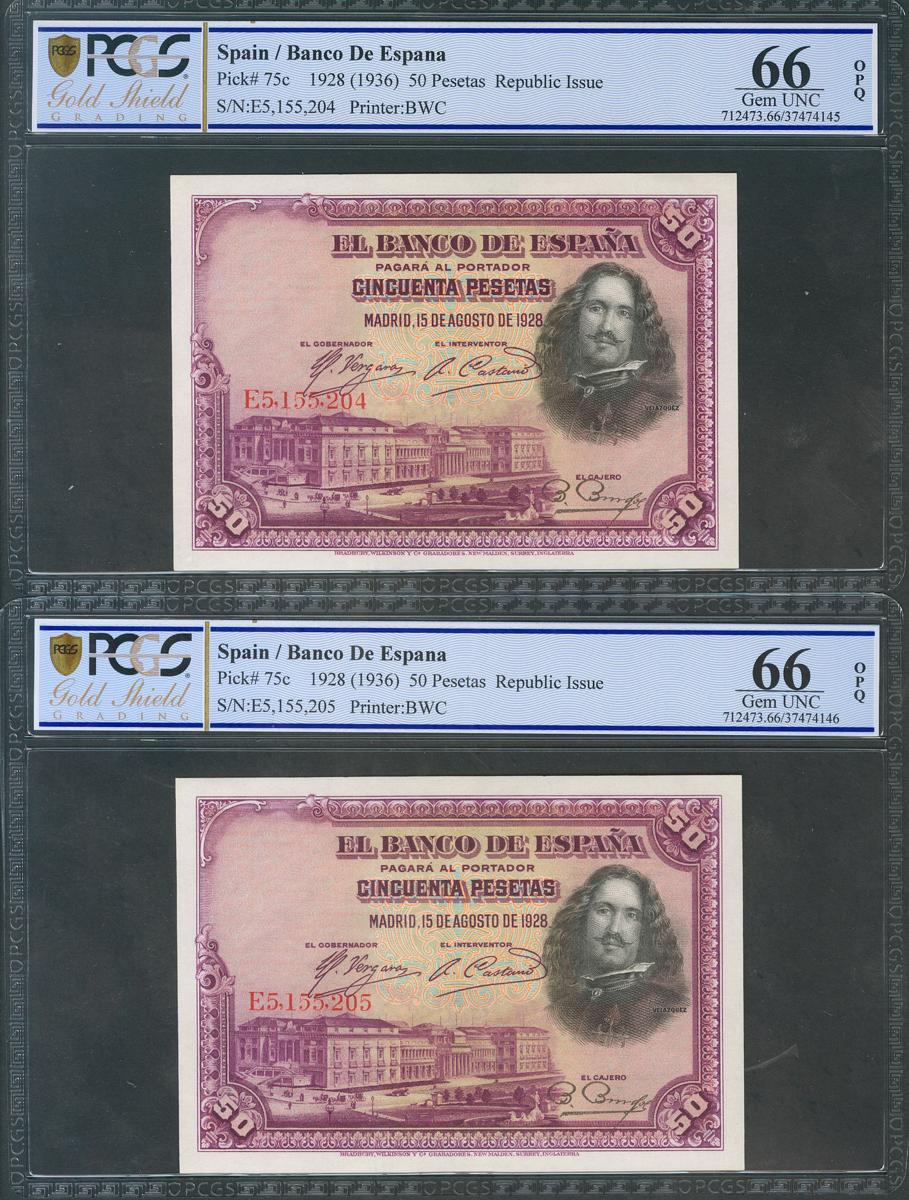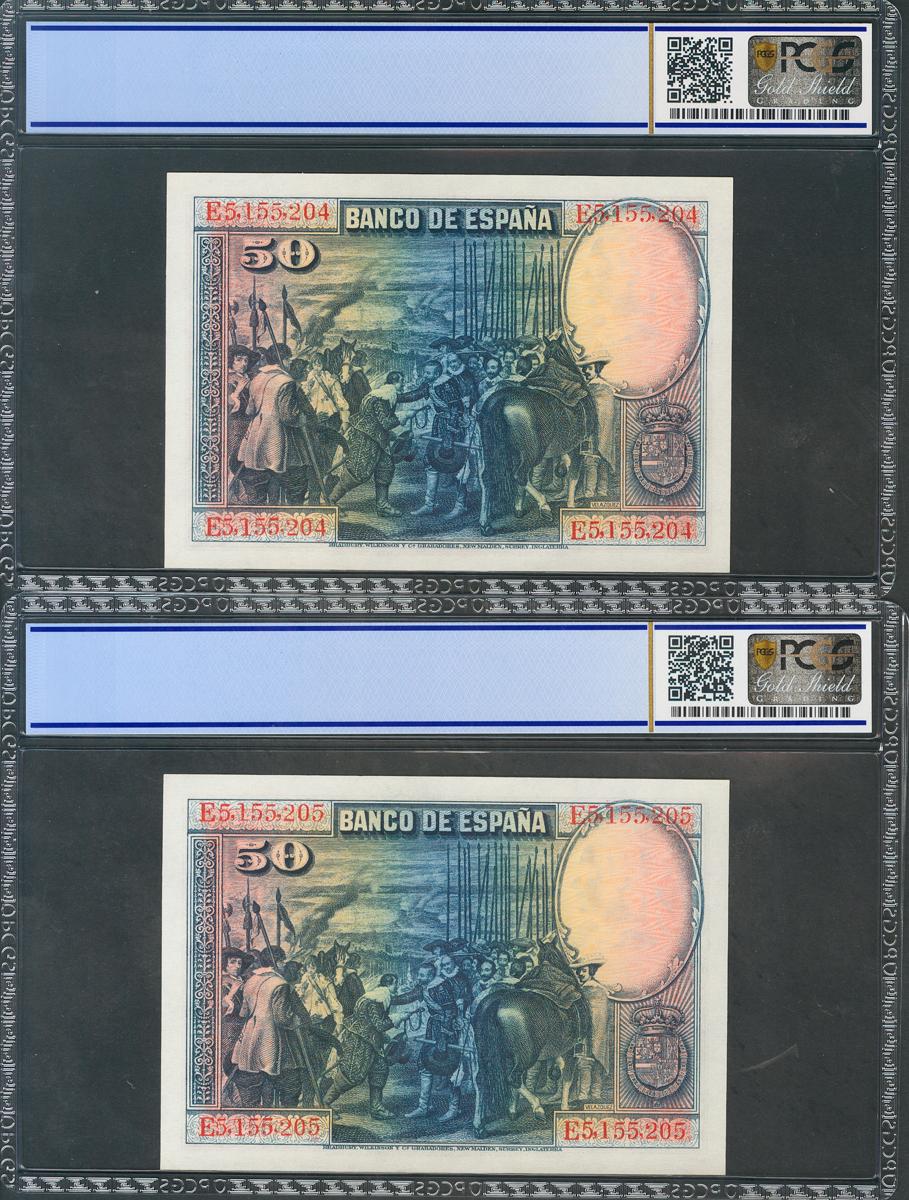 50 Pesetas. 15 de Agosto de 1928. Pareja correlativa. Serie E. (Edifil 2017: 354, Pick: 75c). Apresto original. Encapsulado ambos PCGS66OPQ. SC.