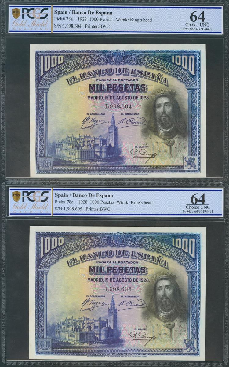 1000 Pesetas. 15 de Agosto de 1928. Pareja correlativa. Sin serie. (Edifil 2017: 357, Pick: 78a). Encapsulado ambos PCGS64. SC.