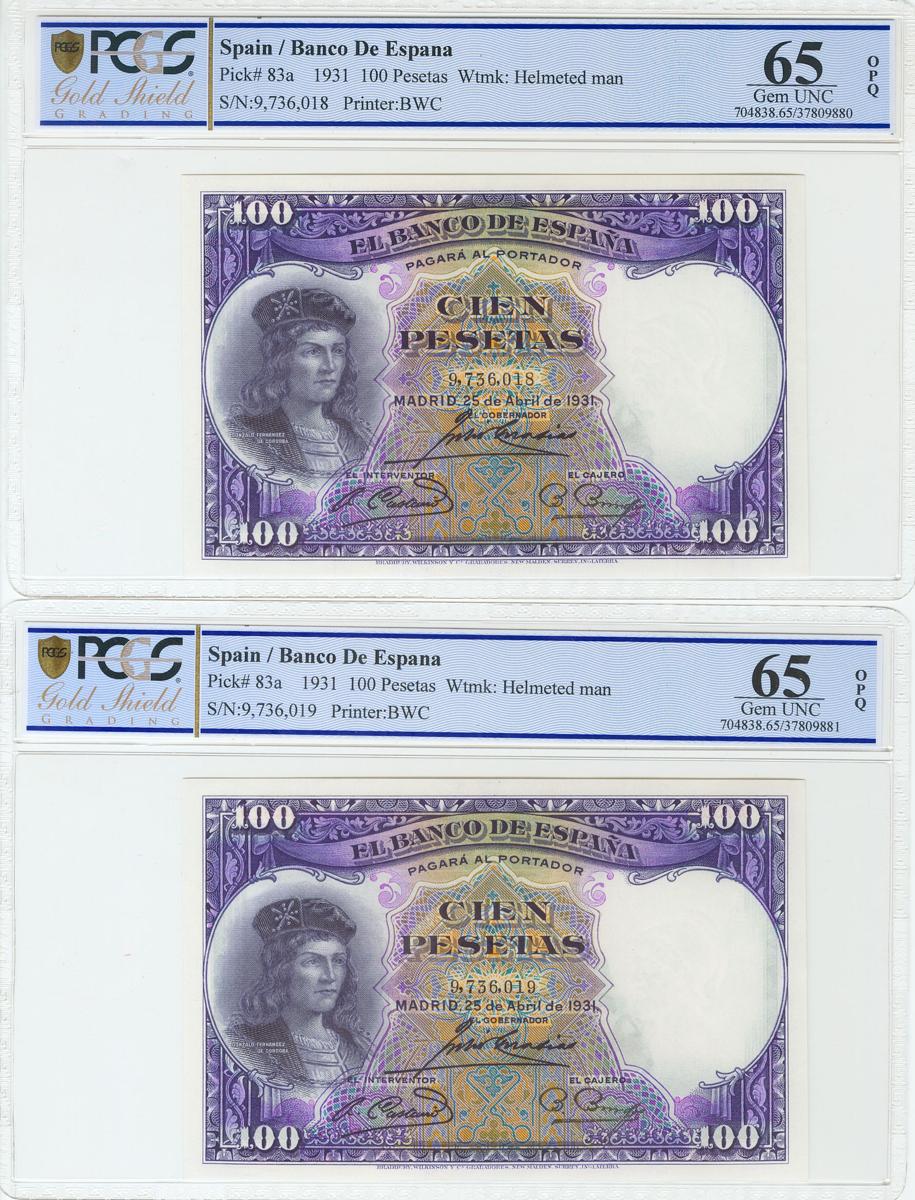 100 Pesetas. 25 de Abril de 1931. Pareja correlativa. Sin serie. (Edifil 2017: 360, Pick: 83a). Apresto original. Encapsulado ambos PCGS65OPQ. SC.
