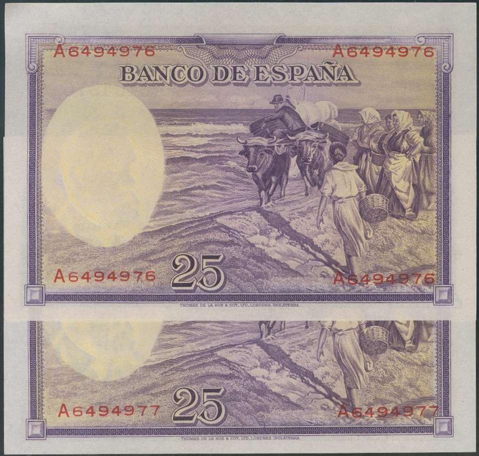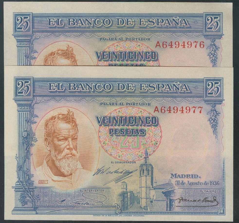 25 Pesetas. 31 de Agosto de 1936. Pareja correlativa. Serie A. (Edifil 2017: 367a). Plancha y apresto original. Inusual. SC.