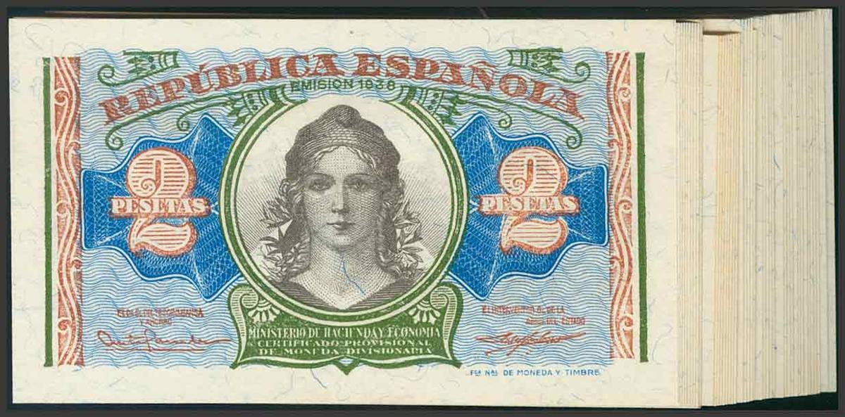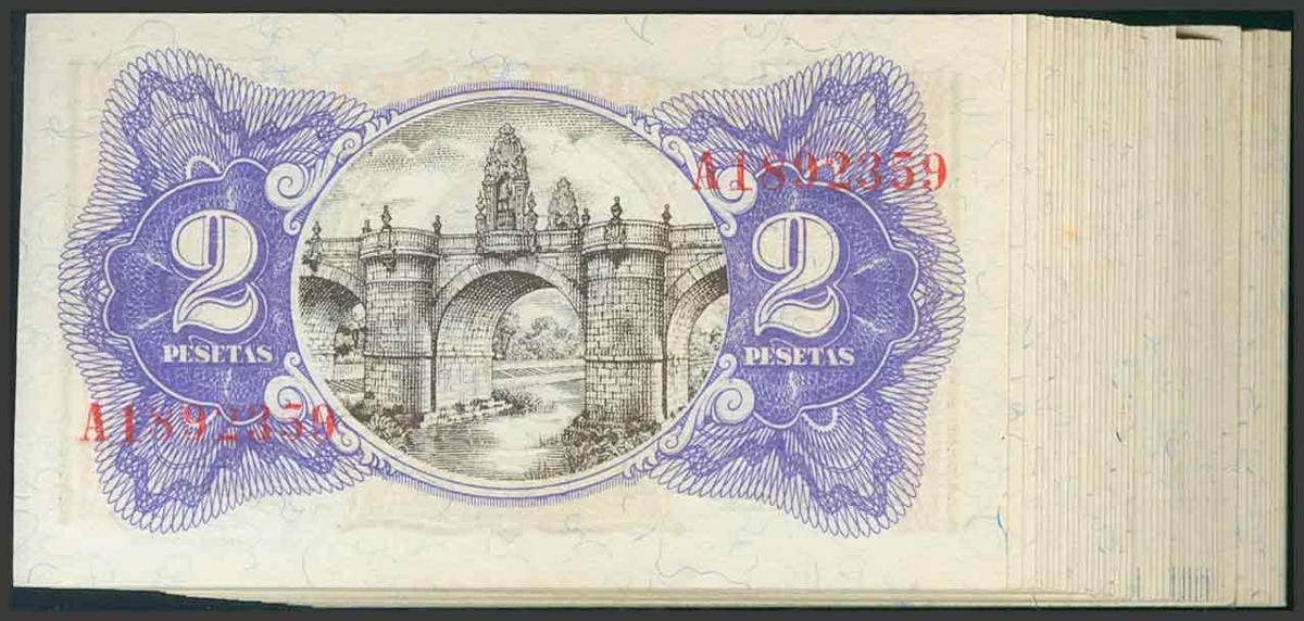 Conjunto de 40 billetes casi todos correlativos del 2 Pesetas emitido el 1 de Enero de 1938, la inmensa mayoría de la serie A (Edifil 2017: 393). SC/SC-.