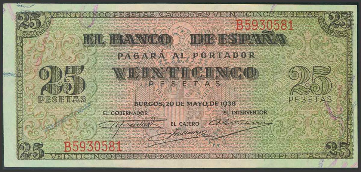 25 Pesetas. 20 de Mayo de 1938. Serie B. (Edifil 2017: 430a). Apresto original. SC.