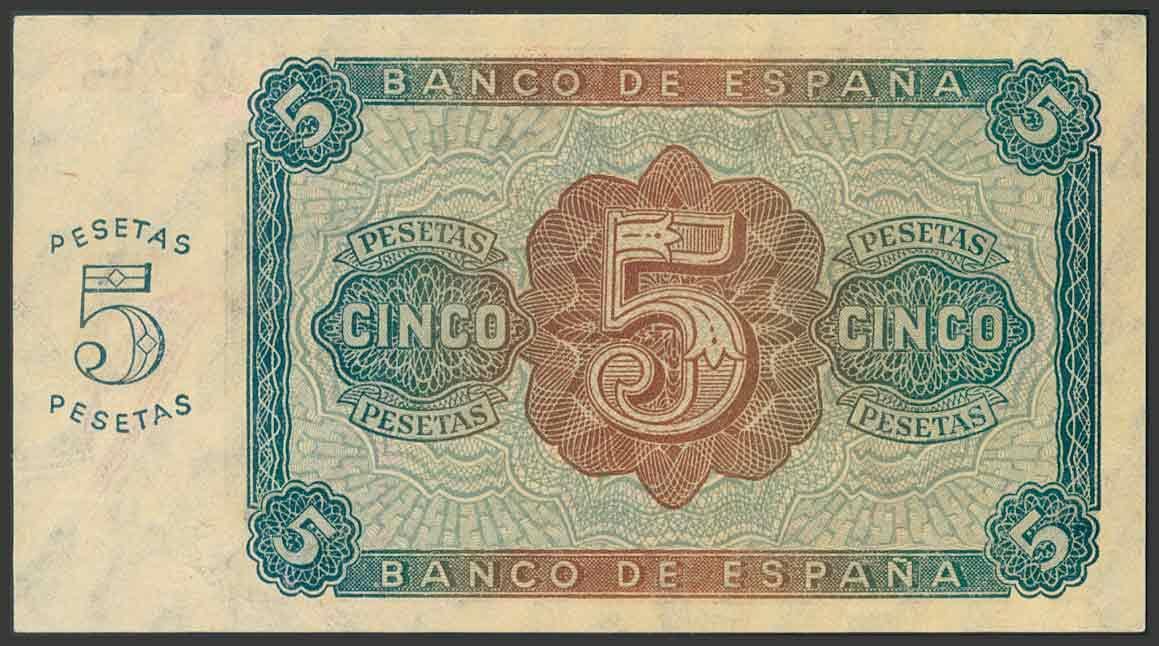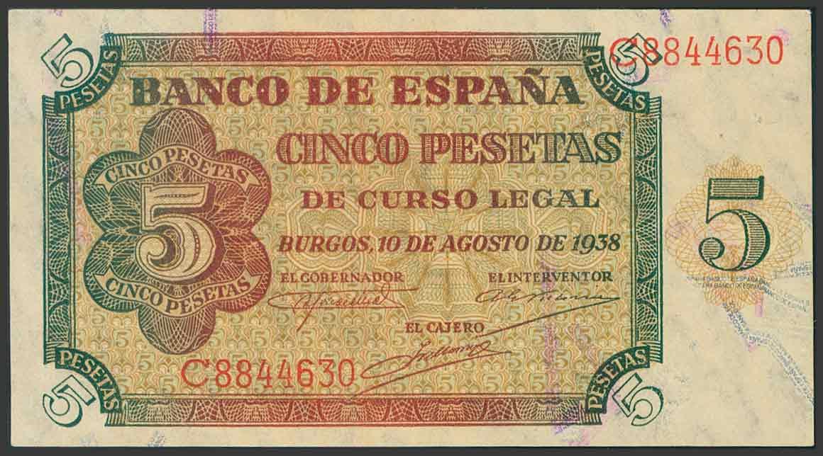 5 Pesetas. 10 de Agosto de 1938. Serie C. (Edifil 2017: 435a). Apresto original. SC-.