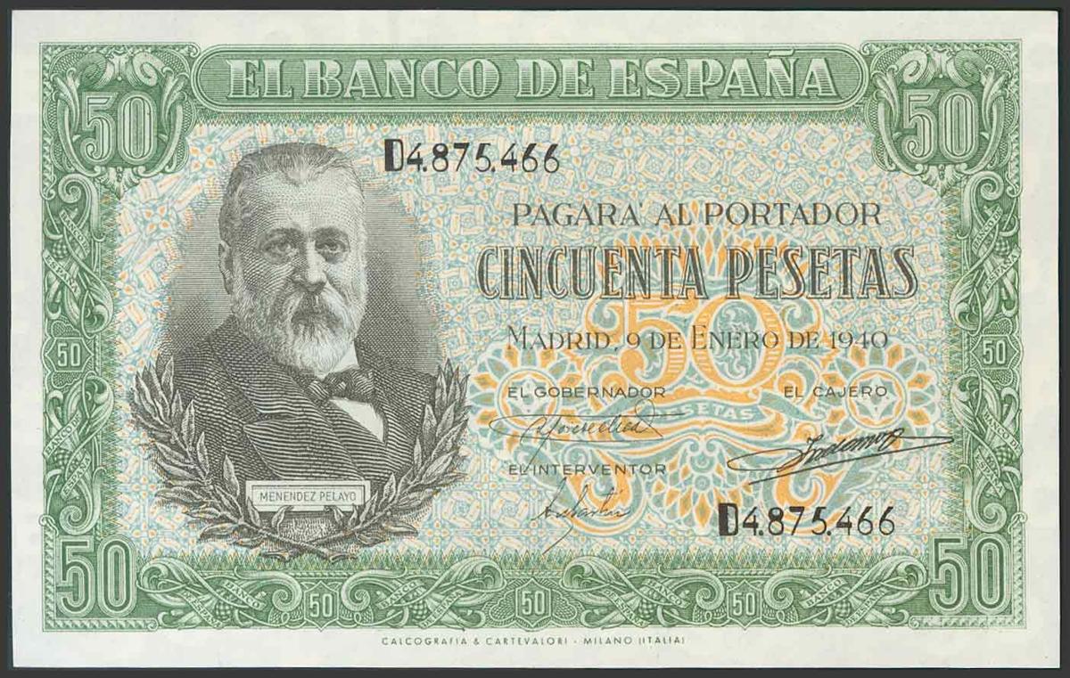 50 Pesetas. 9 de Enero de 1940. Serie D. (Edifil 2017: 437a). Apresto original. SC.