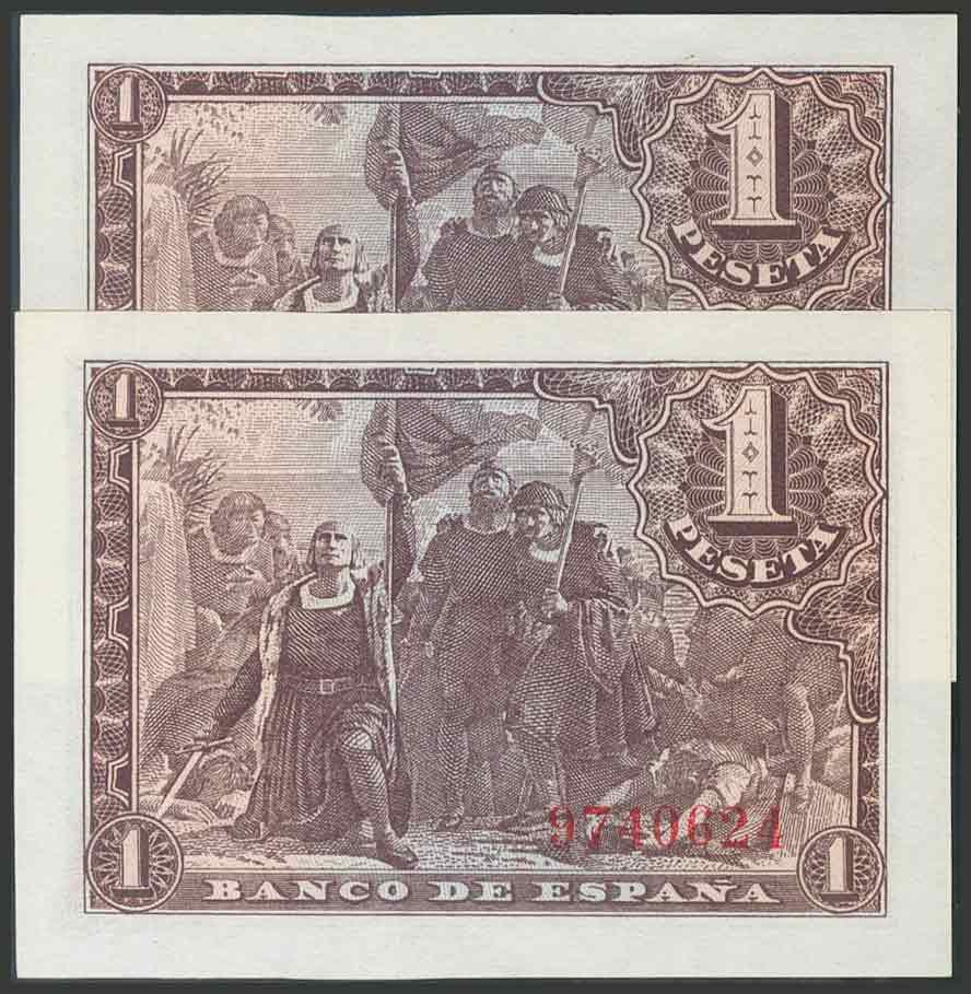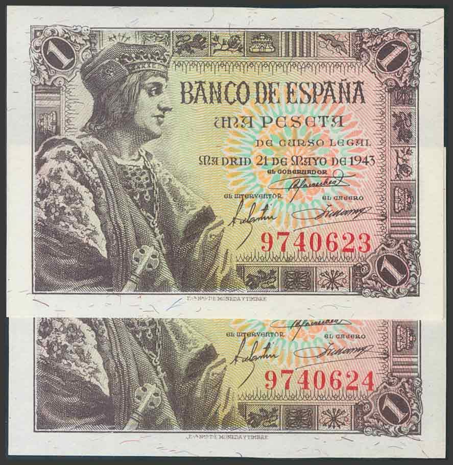 1 Peseta. 21 de Mayo de 1943. Pareja correlativa. Sin serie. (Edifil 2017: 447). Apresto original. SC.