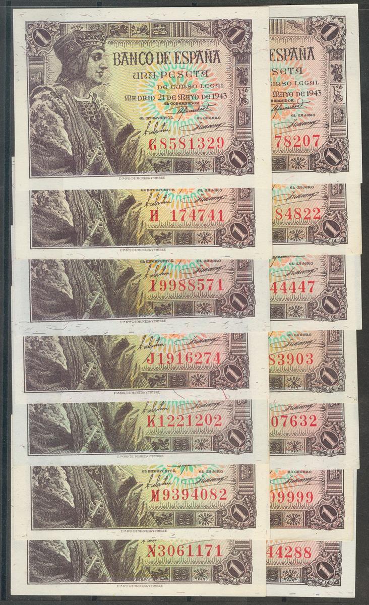 Conjunto de 14 billetes de 1 Peseta emitidos el 21 de Mayo de 1943 con todas las series conocidas desde la A hasta la N (menos la L), incluyendo el sin serie (Edifil 2017: 447, 447a). Inusual conjunto. SC/SC-.