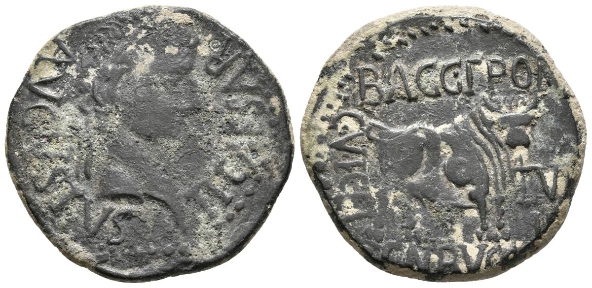 CELSA-KELSE. As. Epoca de Tiberio. 14-37 d.C. Velilla de Ebro (Zaragoza) A/ Cabeza del emperador laureada a derecha, alrededor TI CAESAR AVGVSTVS. R/ Toro a derecha, delante II VIR, detrás C V I CEL, encima BACC FRONT y en exergo CN BVCCO. FAB-820; Vill-161.9. Ae. 9,58g. MBC-/MBC+.