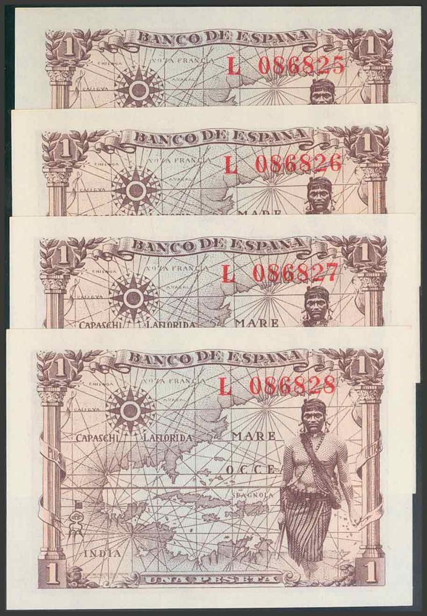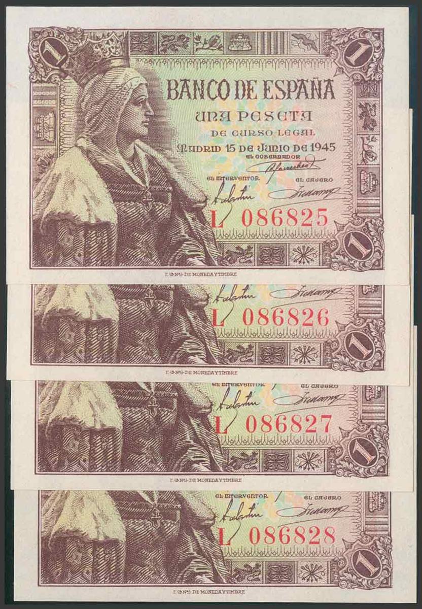 Conjunto de 4 billetes correlativos de 1 Peseta emitidos el 15 de Junio de 1945 de la serie L (Edifil 2017: 448a), todos ellos con apresto original. SC.