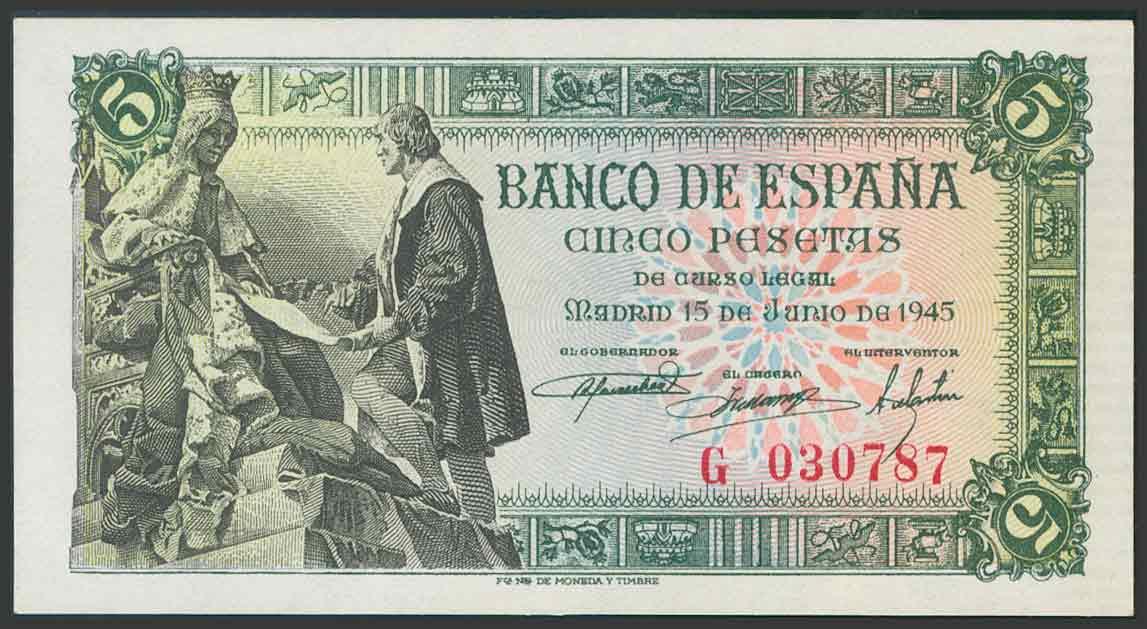 5 Pesetas. 15 de Junio de 1945. Serie G. (Edifil 2017: 449a). SC.