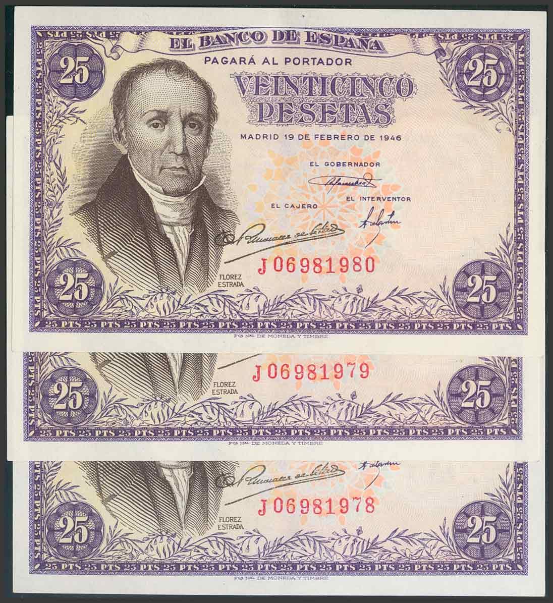 25 Pesetas. 19 de Febrero de 1946. Trío correlativo. Serie J. Doblez vertical sin romper la fibra. (Edifil 2017: 450a). Apresto original. EBC+.
