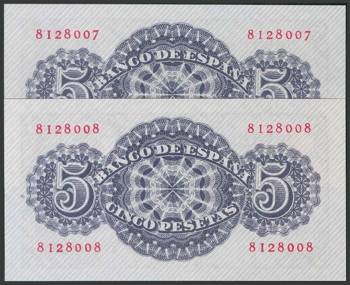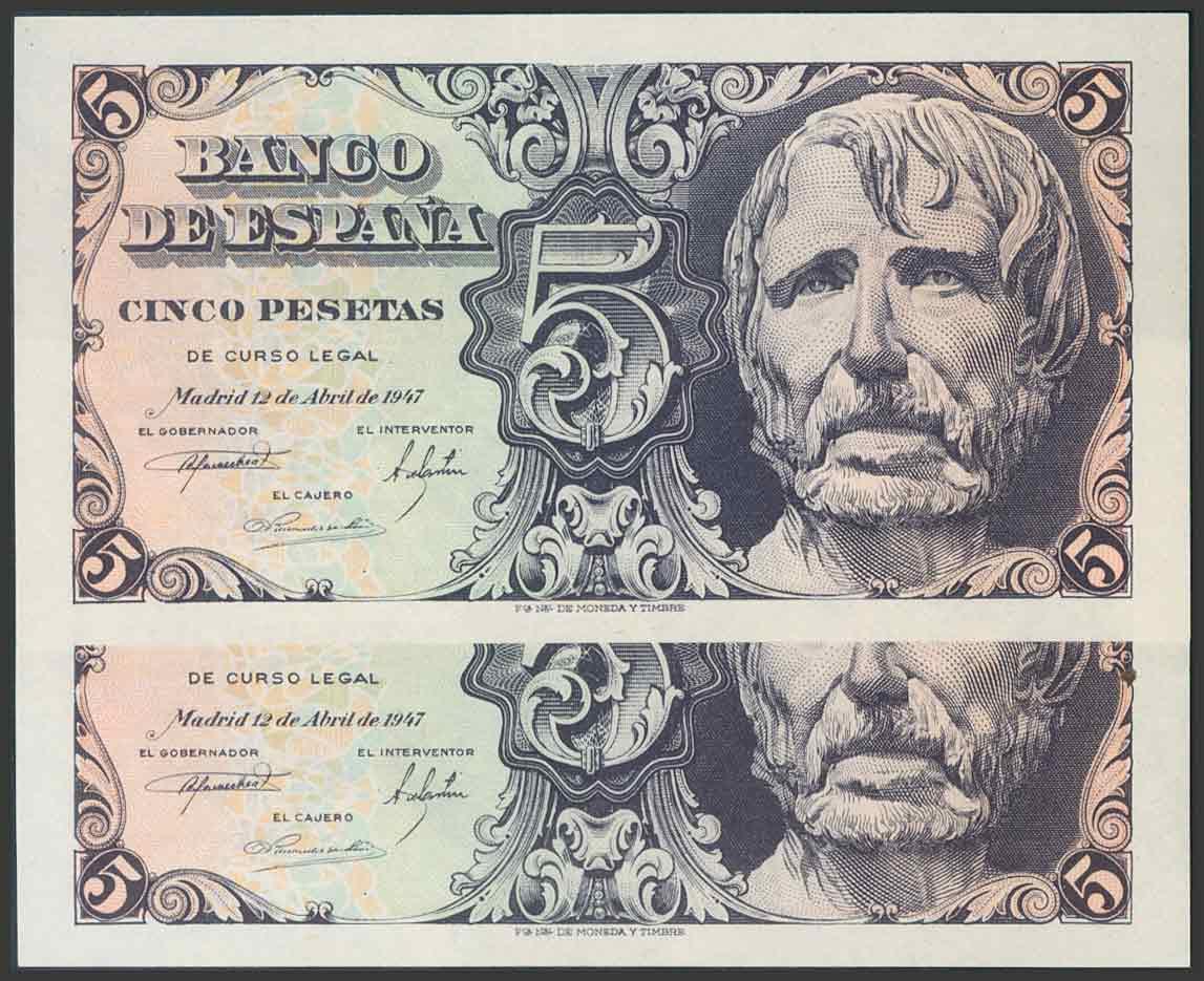 5 Pesetas. 12 de Abril de 1947. Pareja correlativa. Sin serie. (Edifil 2017: 454). Apresto original. SC.