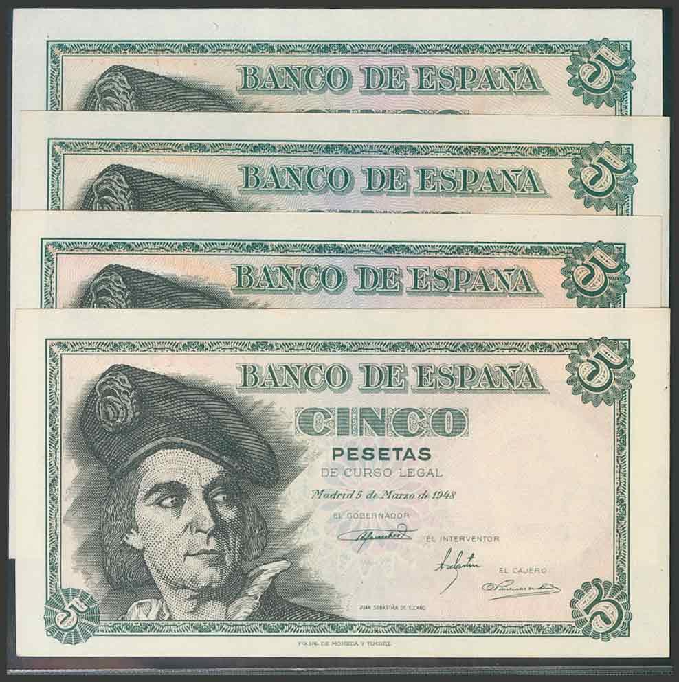 Conjunto de 4 billetes de 5 Pesetas emitidos el 5 de Marzo de 1948, correspondientes a las series A, B, C y G (Edifil 2017: 455a), con apresto original. SC.