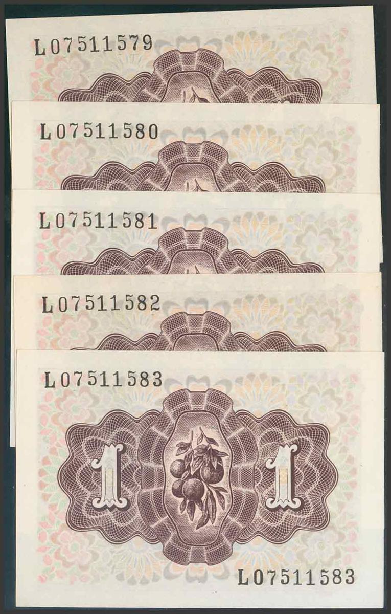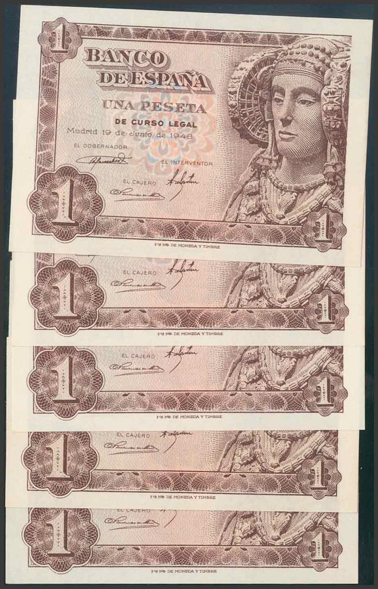 Conjunto de 5 billetes correlativos de 1 Peseta emitidos el 19 de Junio de 1948, de la serie L (Edifil 2017: 457a), con el apresto original. SC.