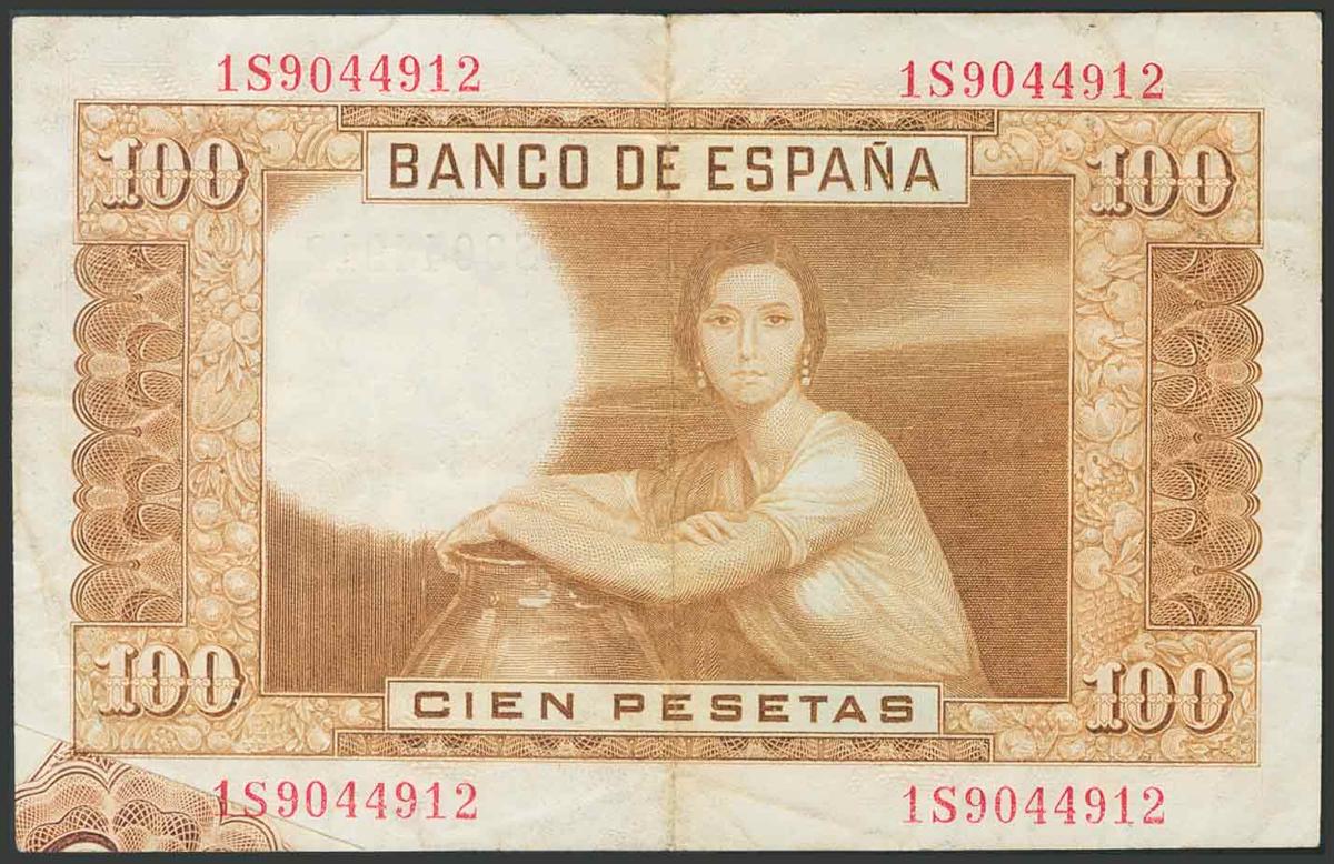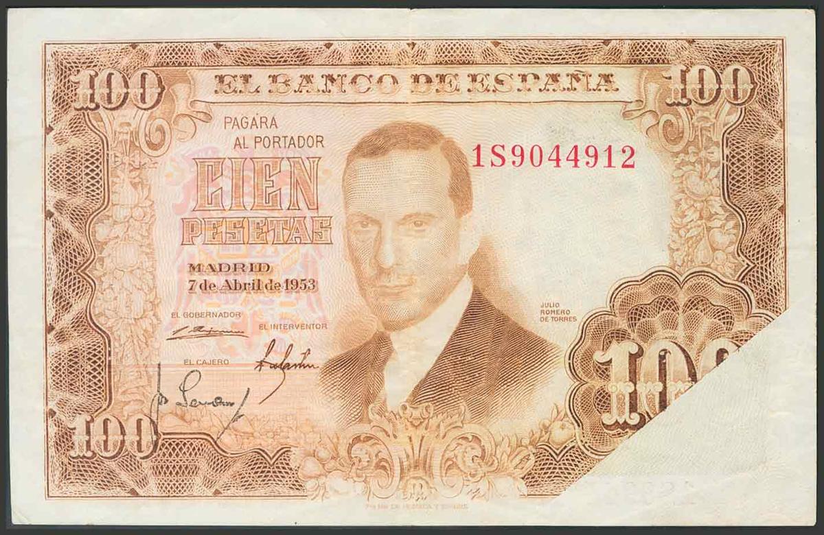100 Pesetas. 7 de Abril de 1953. Error de impresión en el anverso del billete en la parte inferior derecha, y en la parte del anverso. Serie 1S. (Edifil 2017: 464c). MBC+.