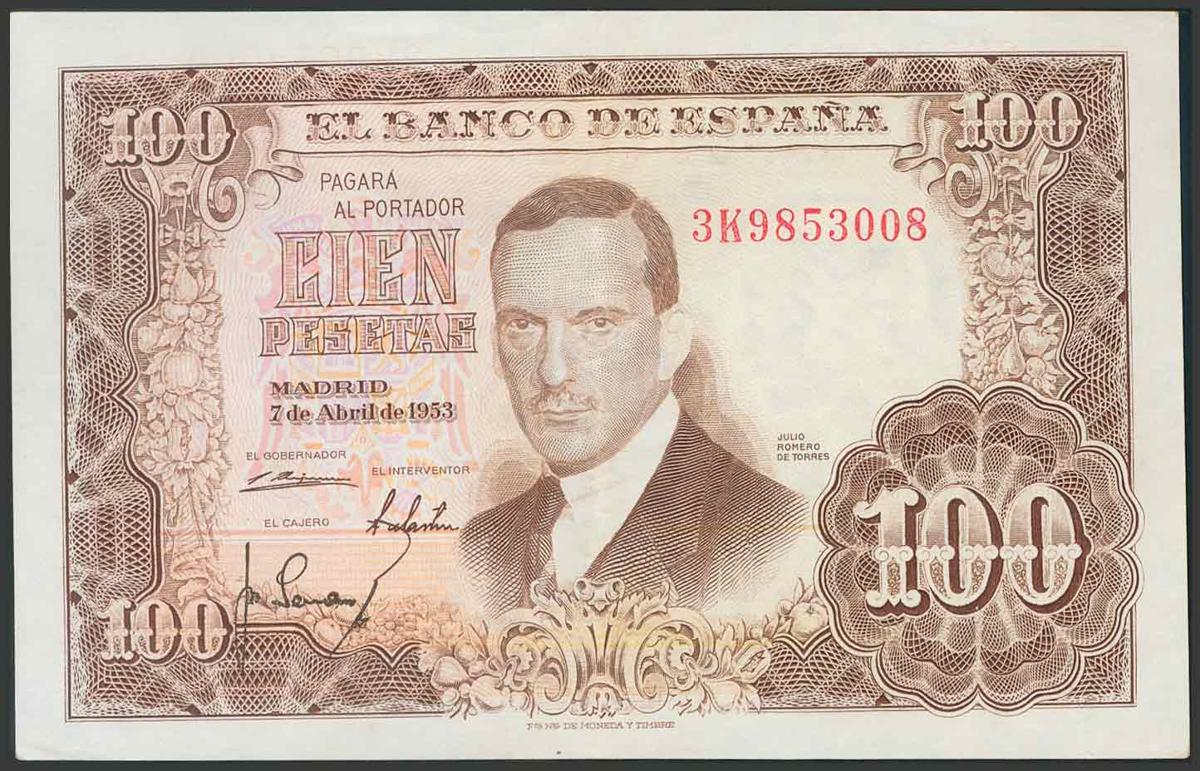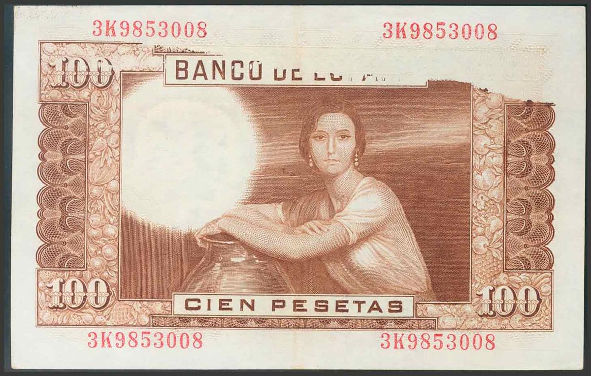 100 Pesetas. 7 de Abril de 1953. Error de impresión en el reverso del billete. Serie 3K. (Edifil 2017: 464c). Apresto original. EBC.