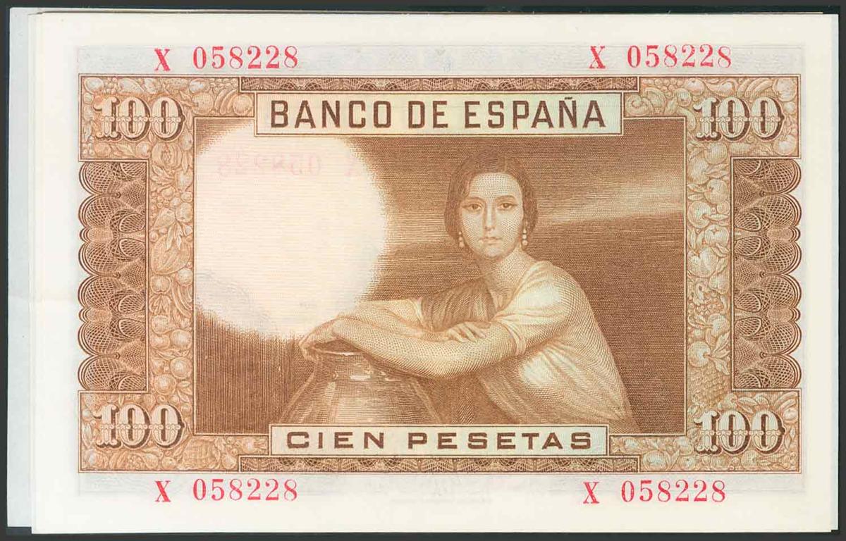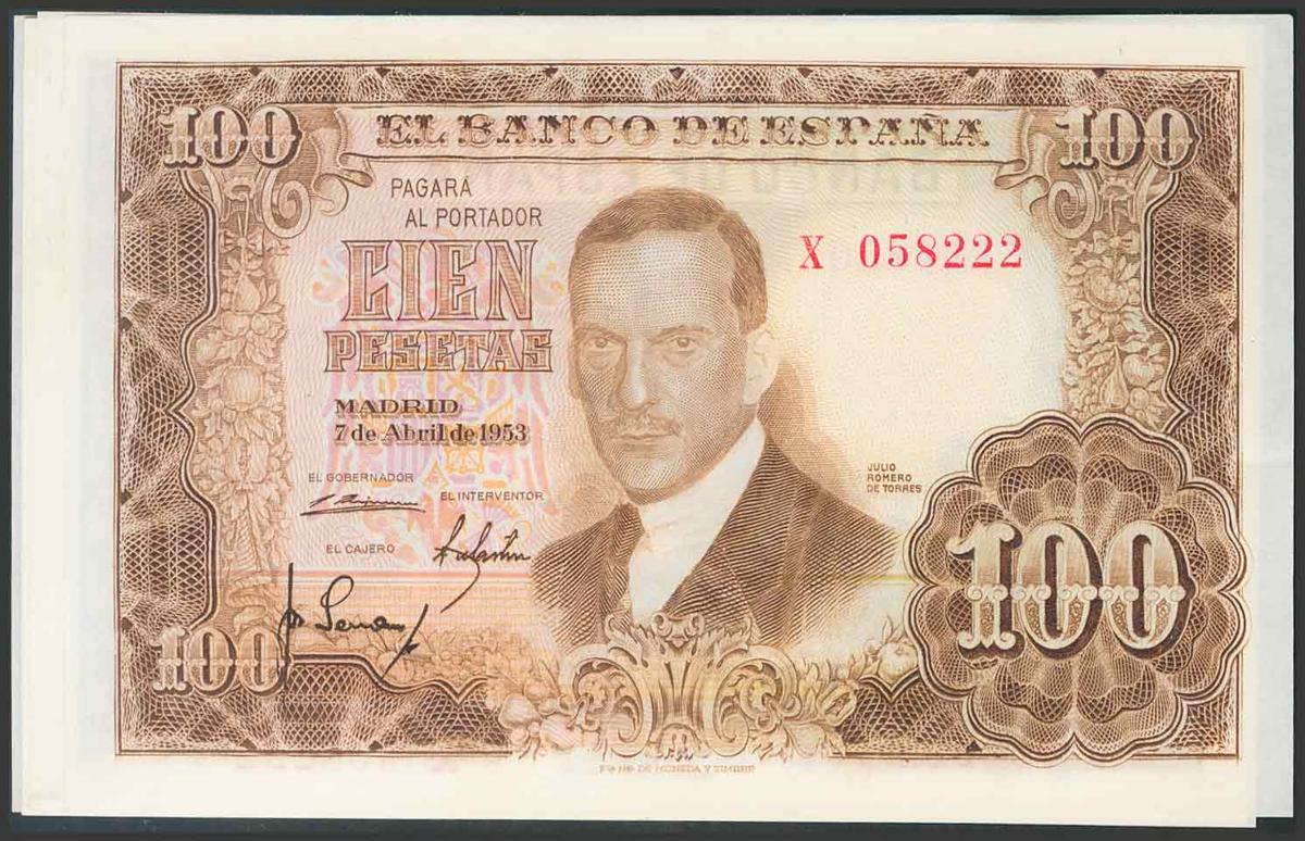 Conjunto de 7 billetes de 100 Pesetas emitidos el 7 de Abril de 1953, serie X (Edifil 2017: 464b). SC.