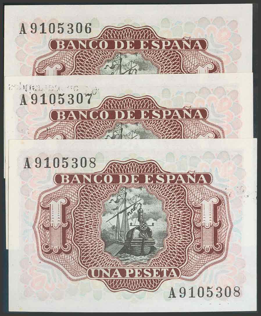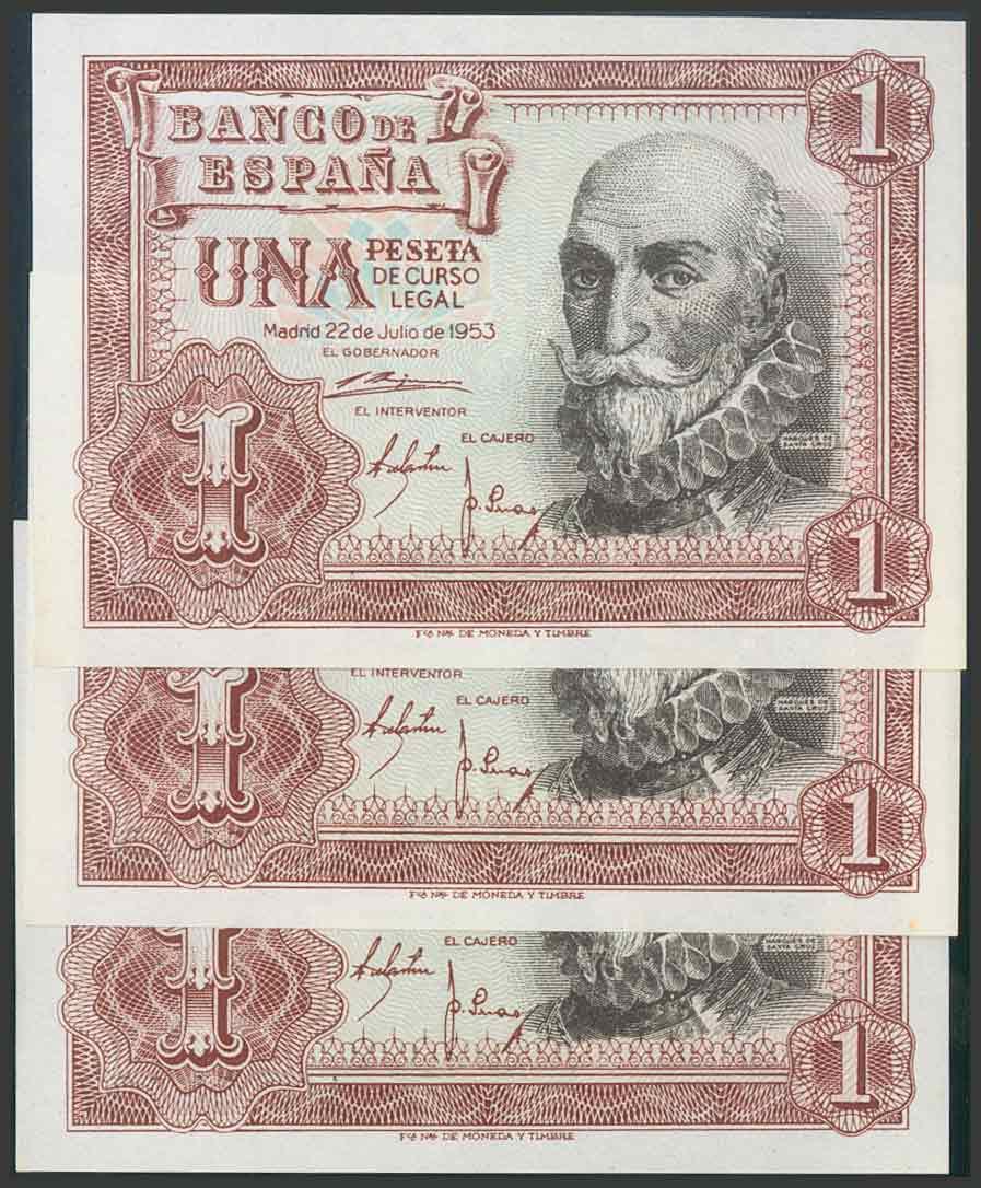 1 Peseta. 22 de Julio de 1953. Trío correlativo. Serie A. (Edifil 2017: 465a). Apresto original. SC.