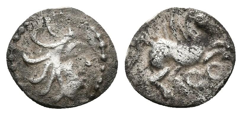 EMPORITON. Hemitritartemorión. Sant Martí de Ampurias (Gerona). 450-400 a.C. A/ Cabeza femenina con tocado a derecha. R/ Pegaso volando a derecha, debajo dos roeles. FAB-1197. Ar. 0,12g. MBC+.