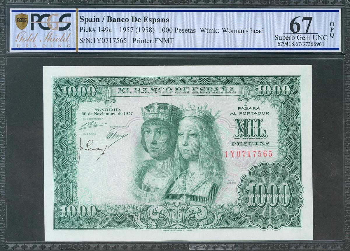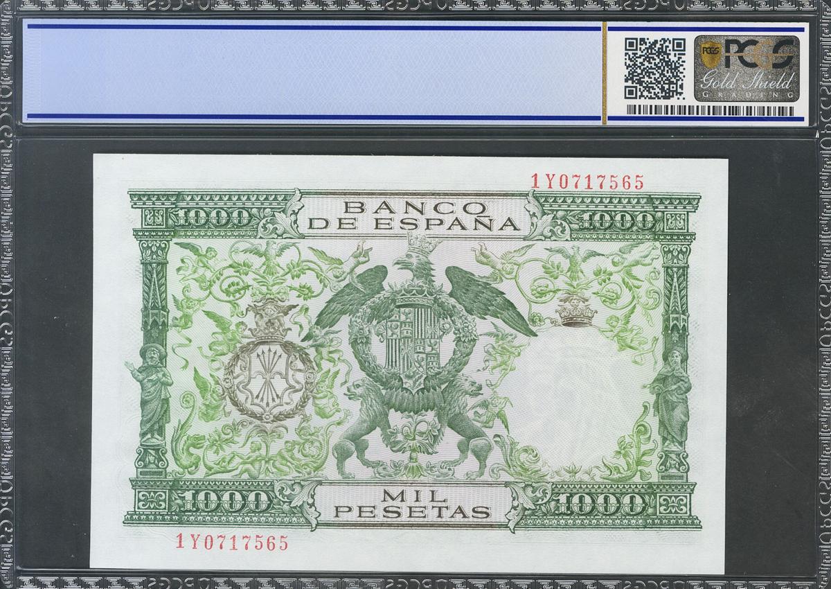 1000 Pesetas. 29 de Noviembre de 1957. Serie 1Y, última serie emitida. (Edifil 2017: 469b, Pick: 149a). Apresto original. Raro. Encapsulado PCGS67OPQ. SC.