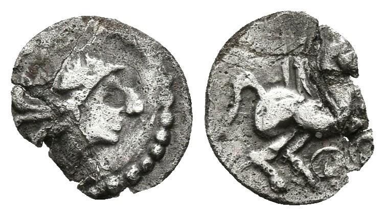 EMPORITON. Hemitritartemorión. Sant Martí de Ampurias (Gerona). 450-400 a.C. A/ Cabeza de ¿Atenea? con casco a derecha. R/ Pegaso volando a derecha, debajo dos roeles. FAB-1197var. Ar. 0,11g. Grieta. MBC.