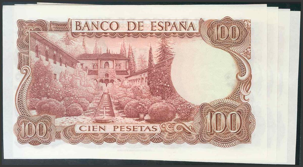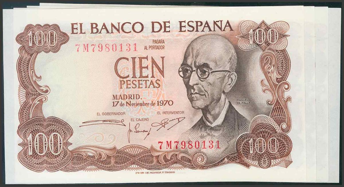 100 Pesetas. 17 de Noviembre de 1970. Cuatro billetes correlativos. Serie 7M. (Edifil 2017: 472c). SC.