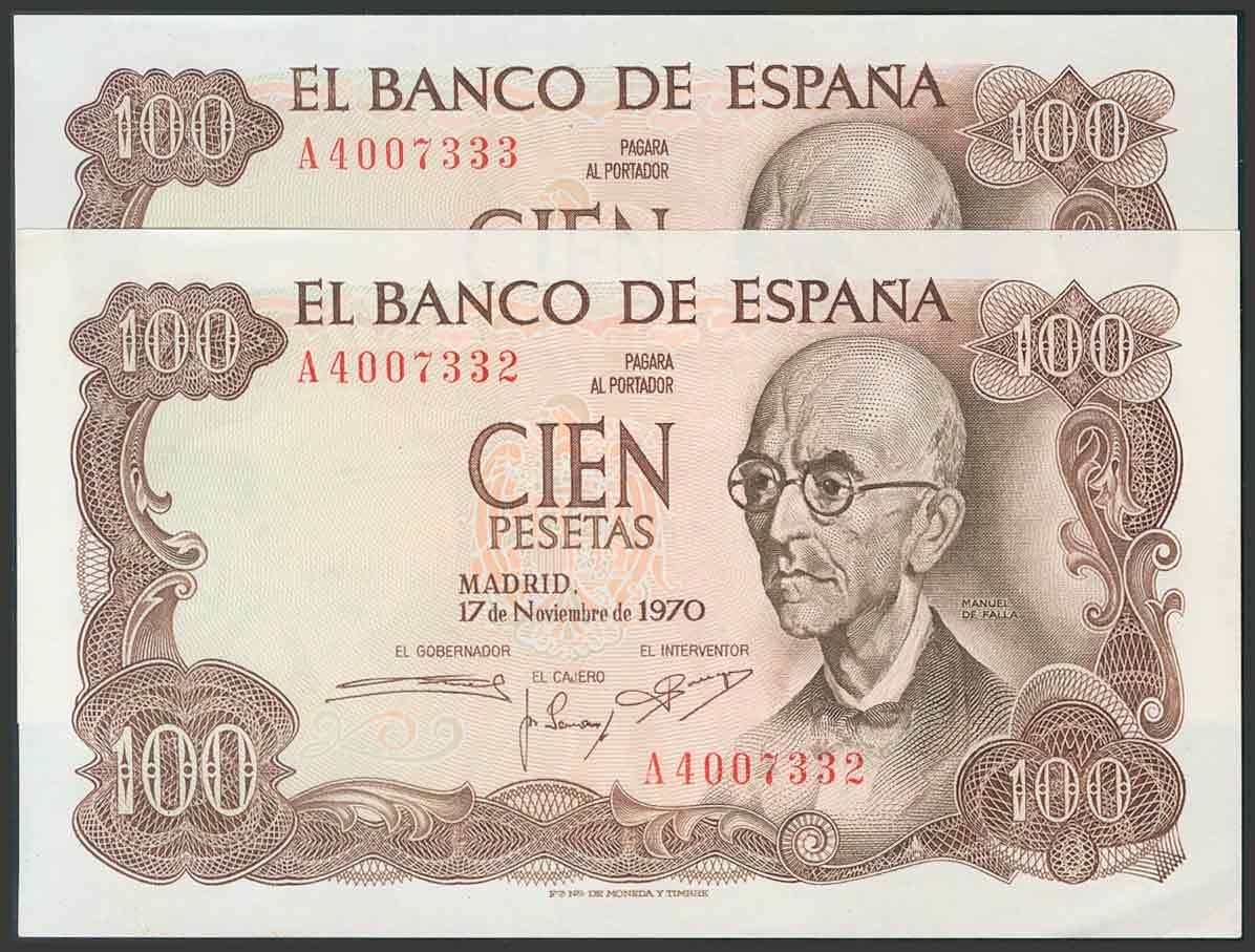 100 Pesetas. 17 de Noviembre de 1970. Pareja correlativa. Serie A. (Edifil 2017: 472a). Apresto original. SC.