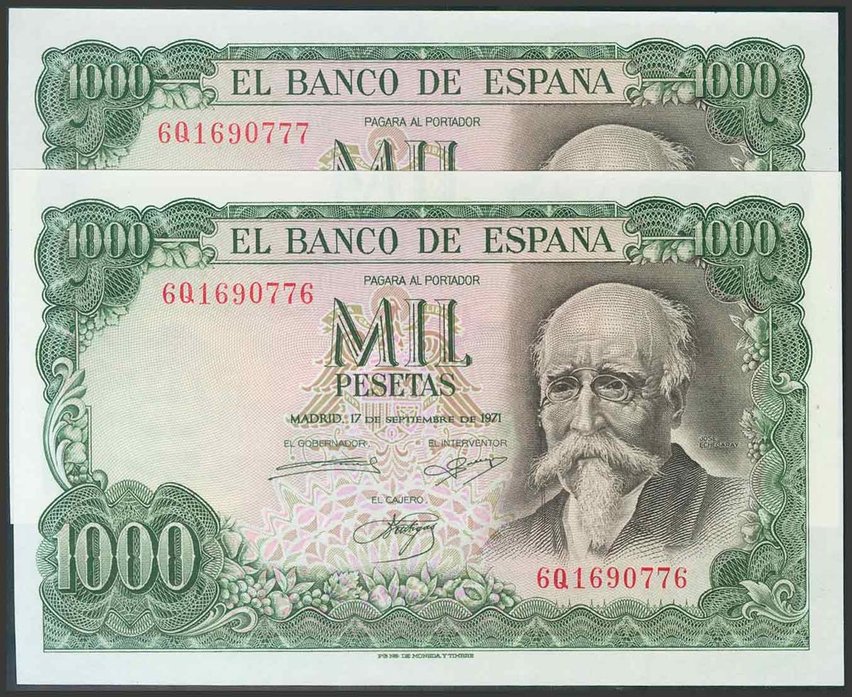 1000 Pesetas. 17 de Septiembre de 1971. Serie 6Q. Pareja correlativa. (Edifil 2017: 474c). SC.