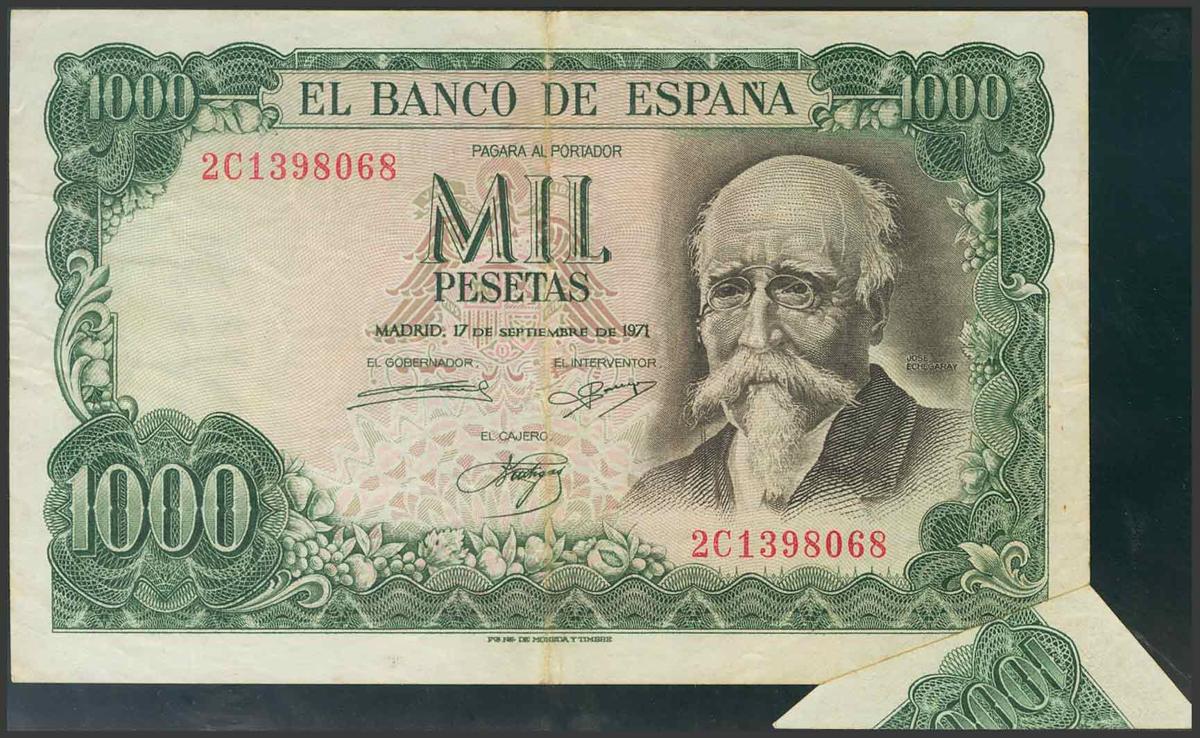 1000 Pesetas. 17 de Septiembre de 1971. Error de impresión y guillotinado. Serie 2C. (Edifil 2017: 474c). Inusual y muy espectacular. MBC.